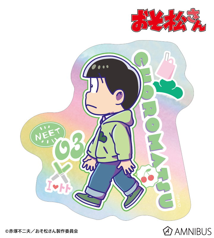 チョロ松が歩いているちびキャラを新たに描き起こし、キャラクターモチーフをデザインしたオーロラステッカーに仕上げました。