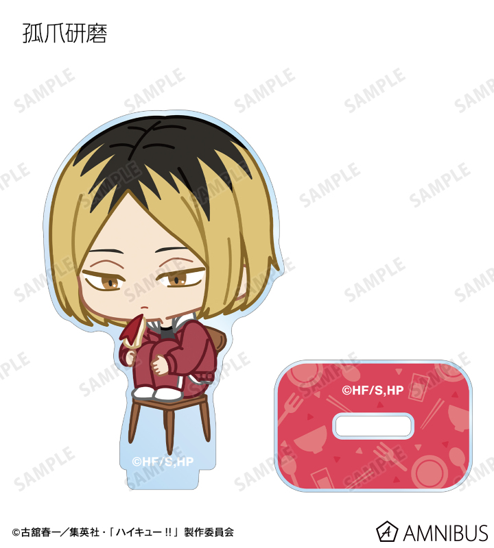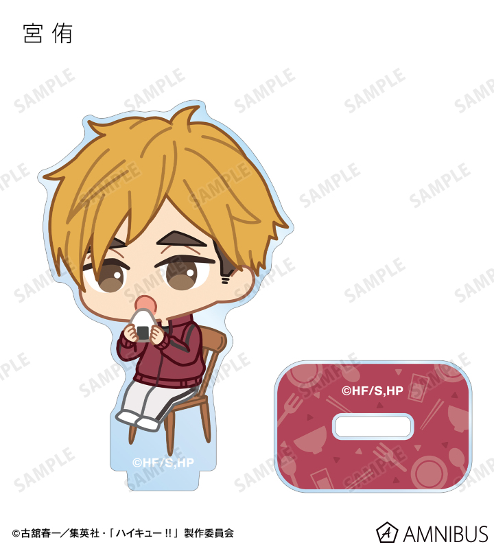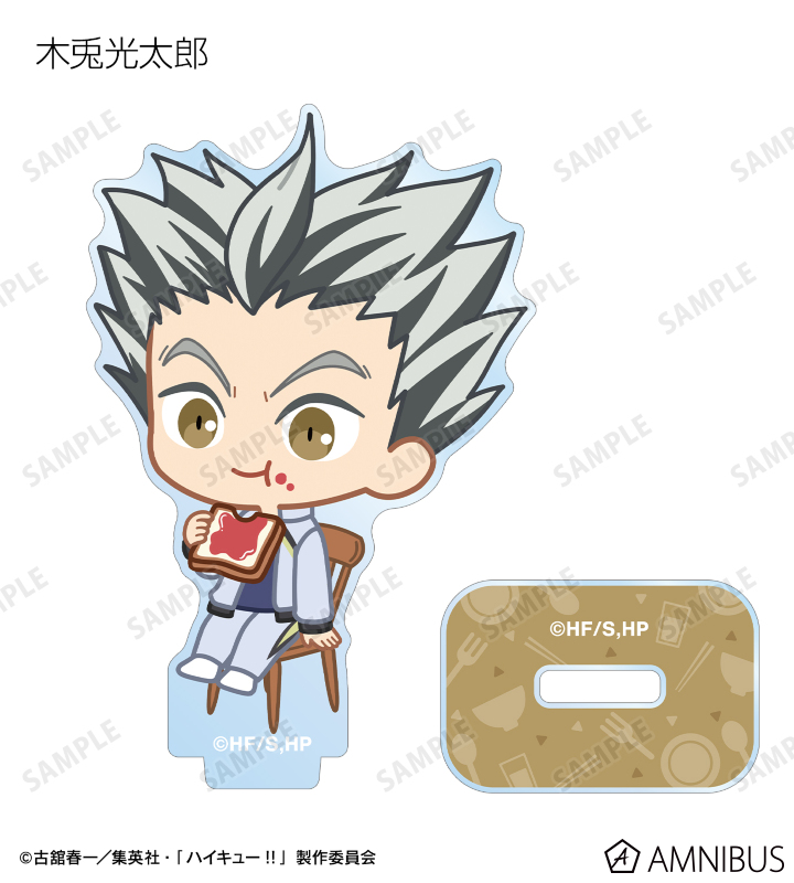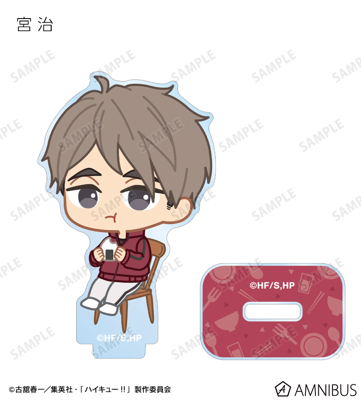 黒尾鉄朗、孤爪研磨、木兎光太郎、赤葦京治、宮 侑、宮 治、北 信介、角名倫太郎の描き起こしちびキャライラストをメインにデザインし、アクリルスタンドに仕上げました。