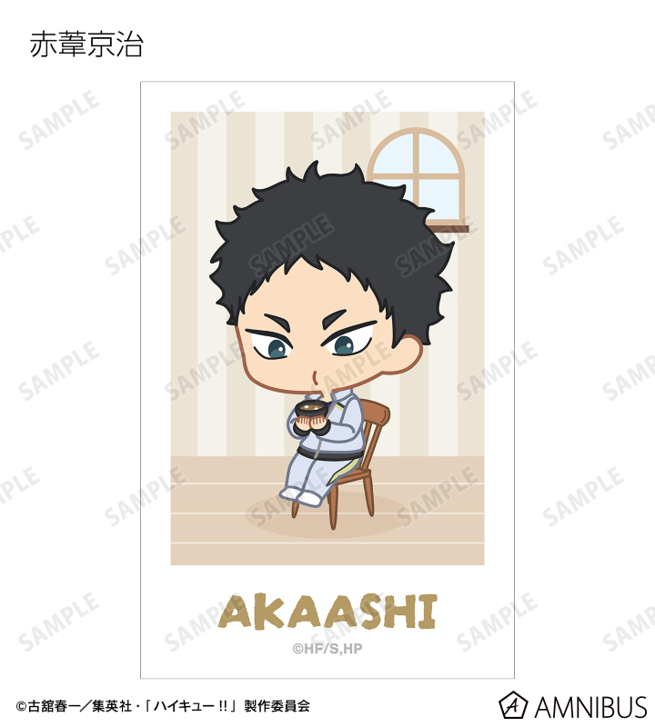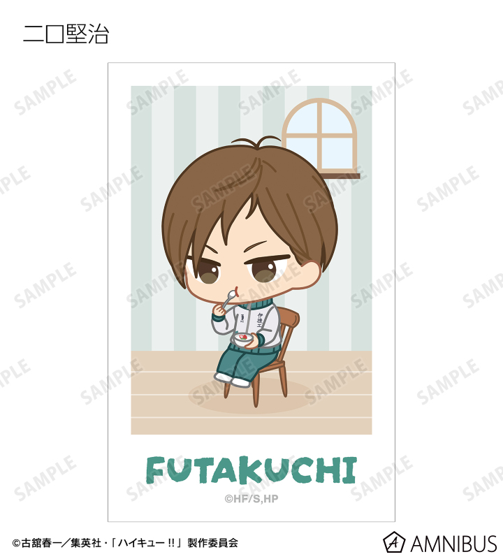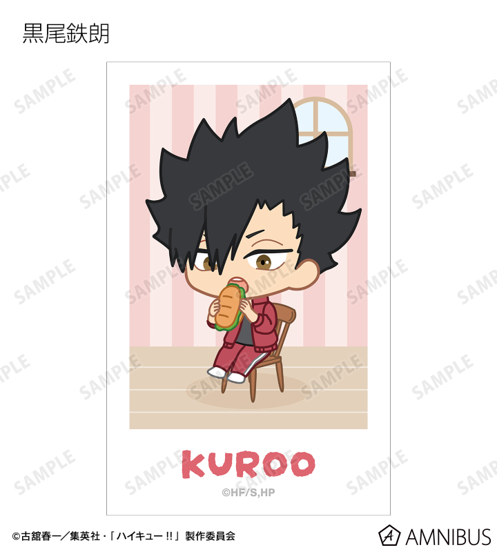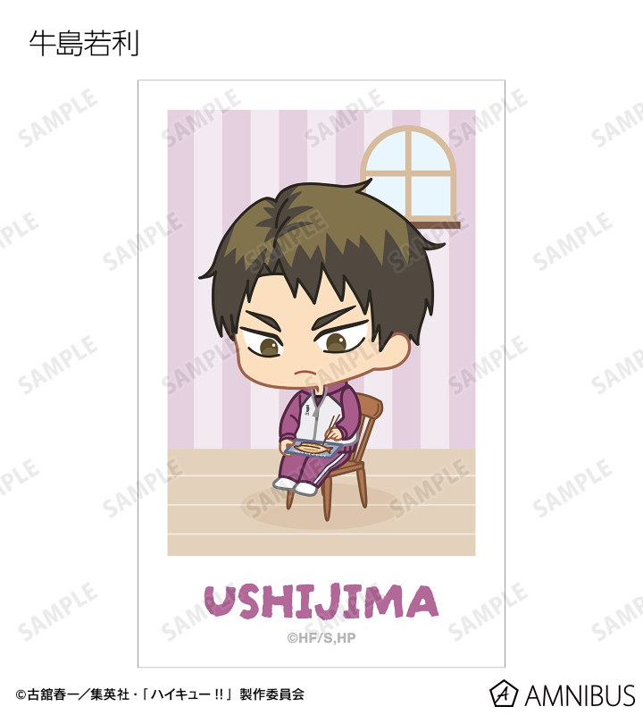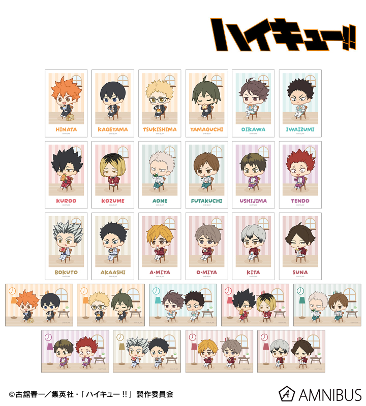 日向翔陽、影山飛雄、月島 蛍、山口 忠、及川 徹、岩泉 一、黒尾鉄朗、孤爪研磨、青根高伸、二口堅治、牛島若利、天童 覚、木兎光太郎、赤葦京治、宮 侑、宮 治、北 信介、角名倫太郎の描き起こしちびキャライラストをメインにデザインし、ビジュアルカードに仕上げました。