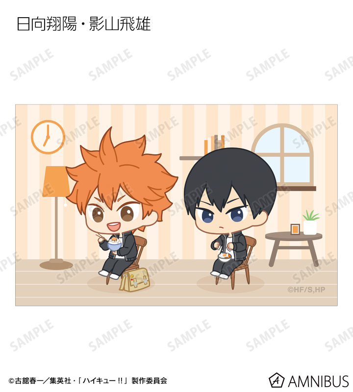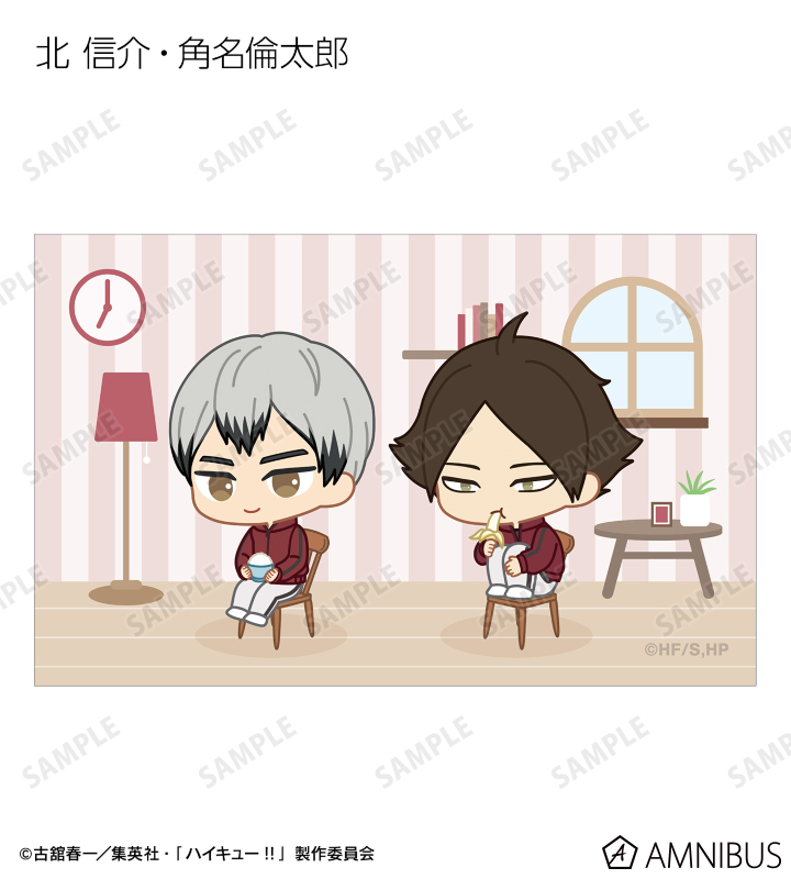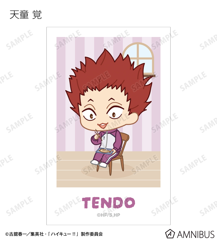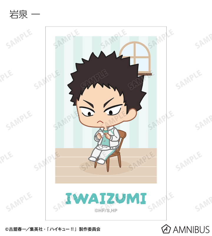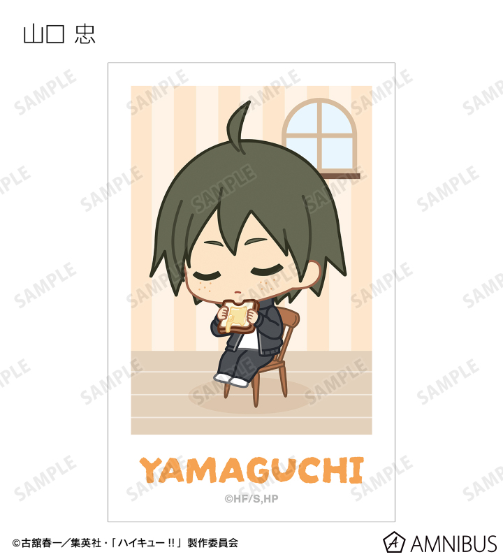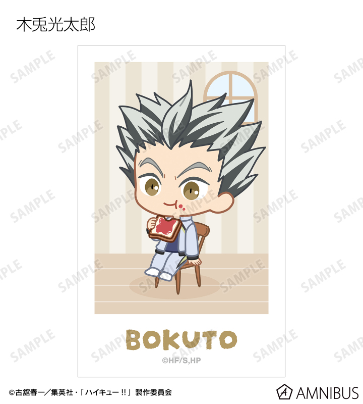 日向翔陽、影山飛雄、月島 蛍、山口 忠、及川 徹、岩泉 一、黒尾鉄朗、孤爪研磨、青根高伸、二口堅治、牛島若利、天童 覚、木兎光太郎、赤葦京治、宮 侑、宮 治、北 信介、角名倫太郎の描き起こしちびキャライラストをメインにデザインし、ビジュアルカードに仕上げました。