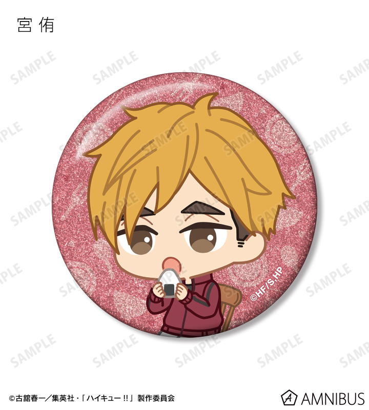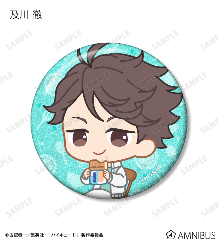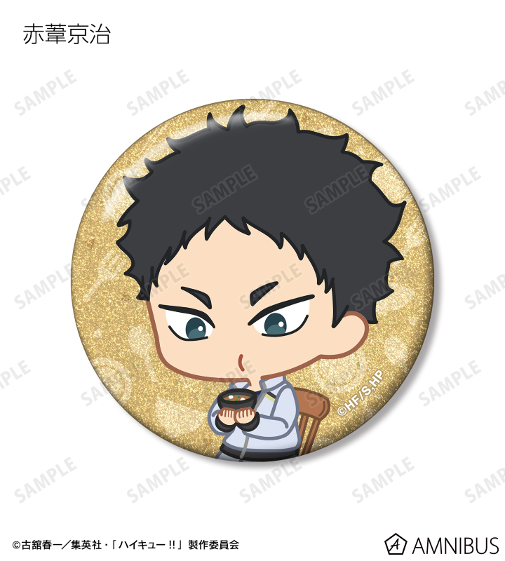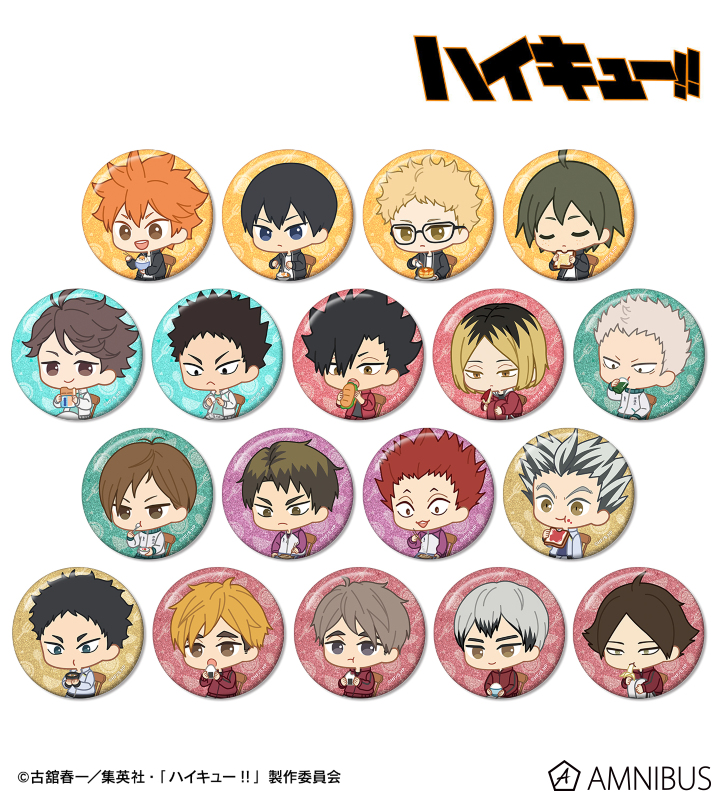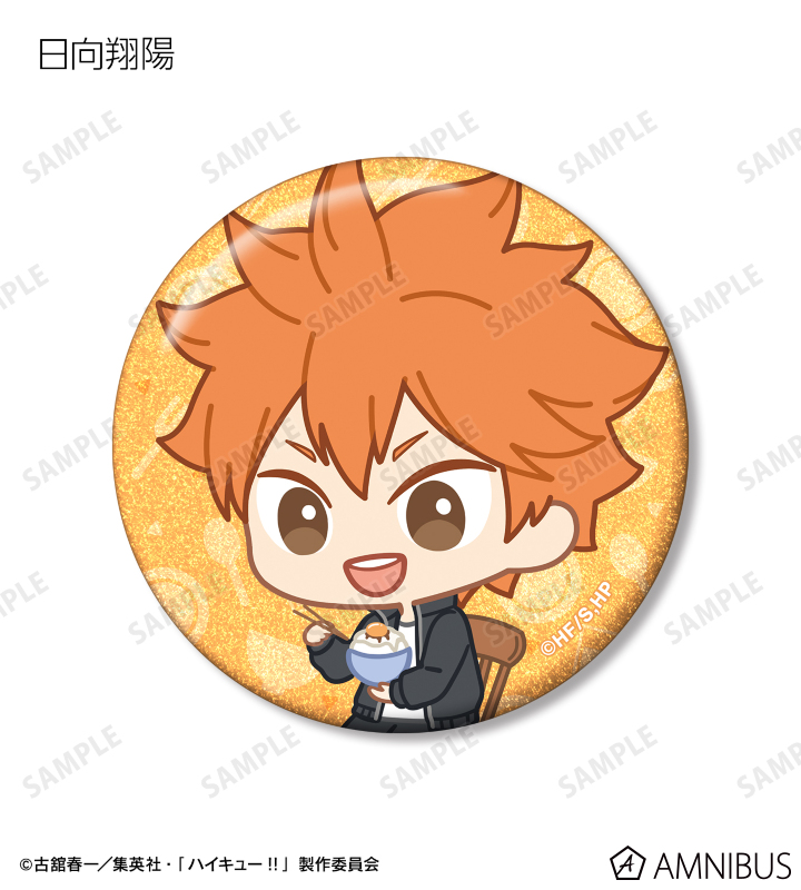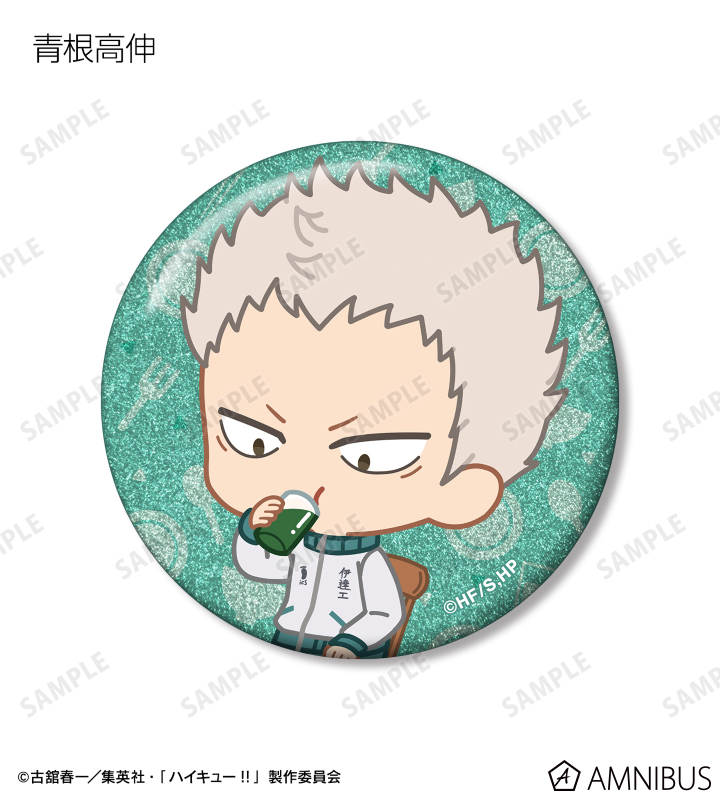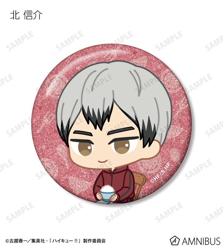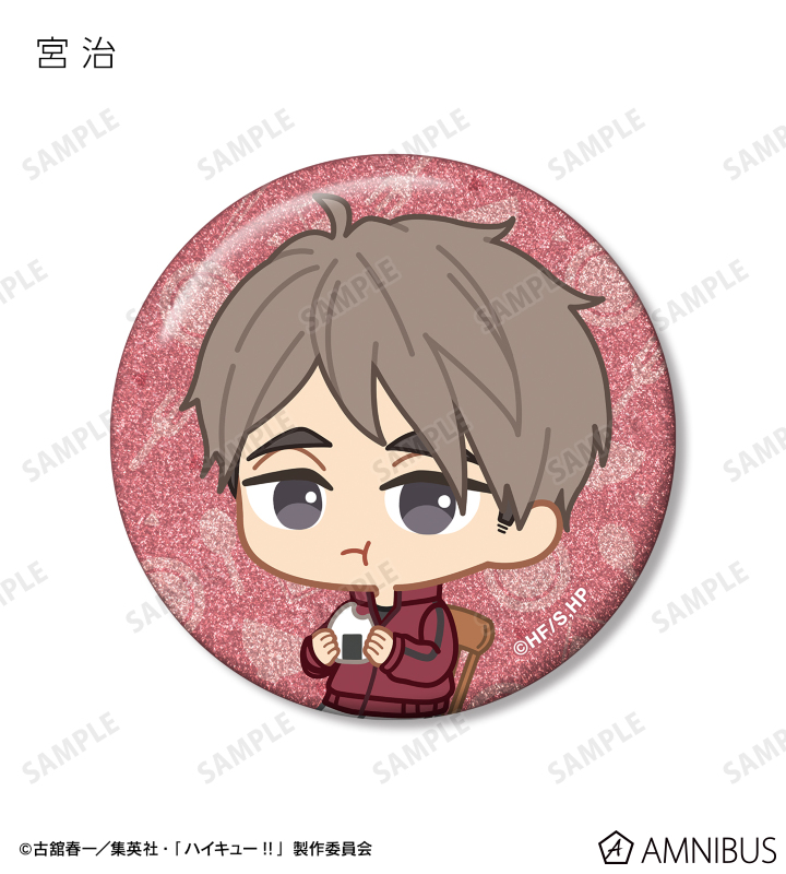 日向翔陽、影山飛雄、月島 蛍、山口 忠、及川 徹、岩泉 一、黒尾鉄朗、孤爪研磨、青根高伸、二口堅治、牛島若利、天童 覚、木兎光太郎、赤葦京治、宮 侑、宮 治、北 信介、角名倫太郎の描き起こしちびキャライラストをメインにデザインし、グリッター加工を施した缶バッジに仕上げました。