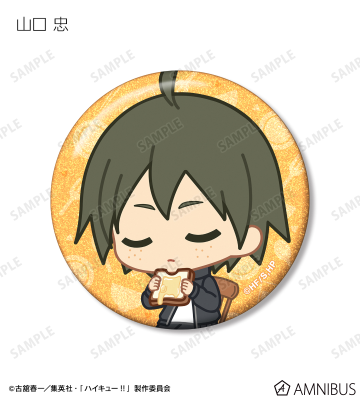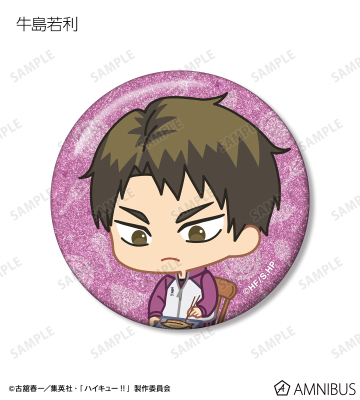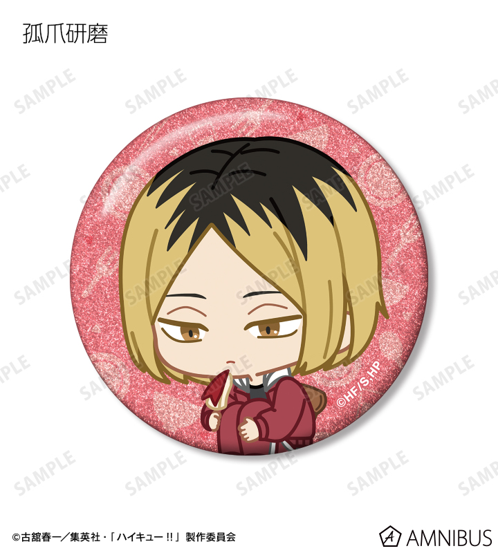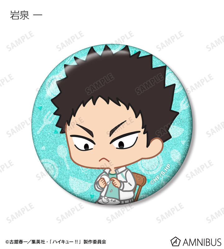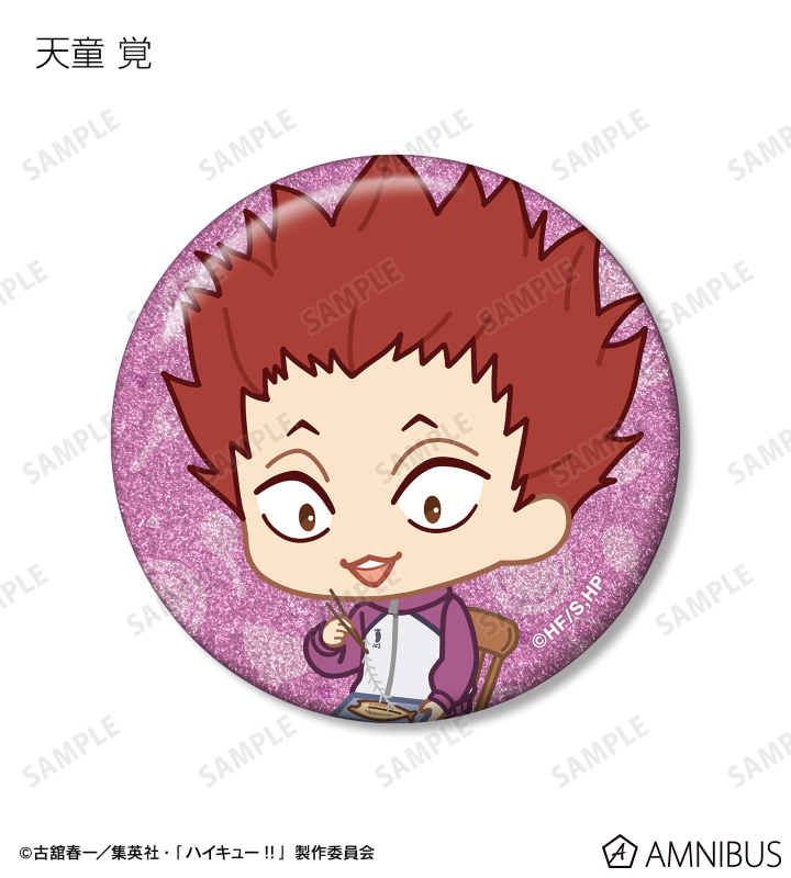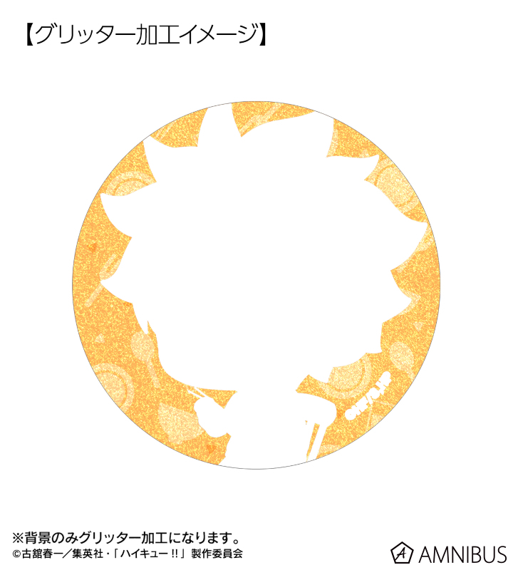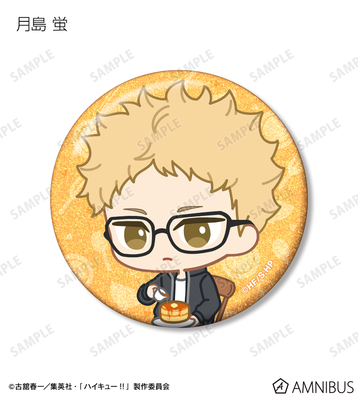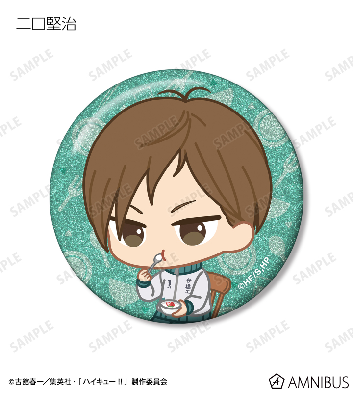 日向翔陽、影山飛雄、月島 蛍、山口 忠、及川 徹、岩泉 一、黒尾鉄朗、孤爪研磨、青根高伸、二口堅治、牛島若利、天童 覚、木兎光太郎、赤葦京治、宮 侑、宮 治、北 信介、角名倫太郎の描き起こしちびキャライラストをメインにデザインし、グリッター加工を施した缶バッジに仕上げました。