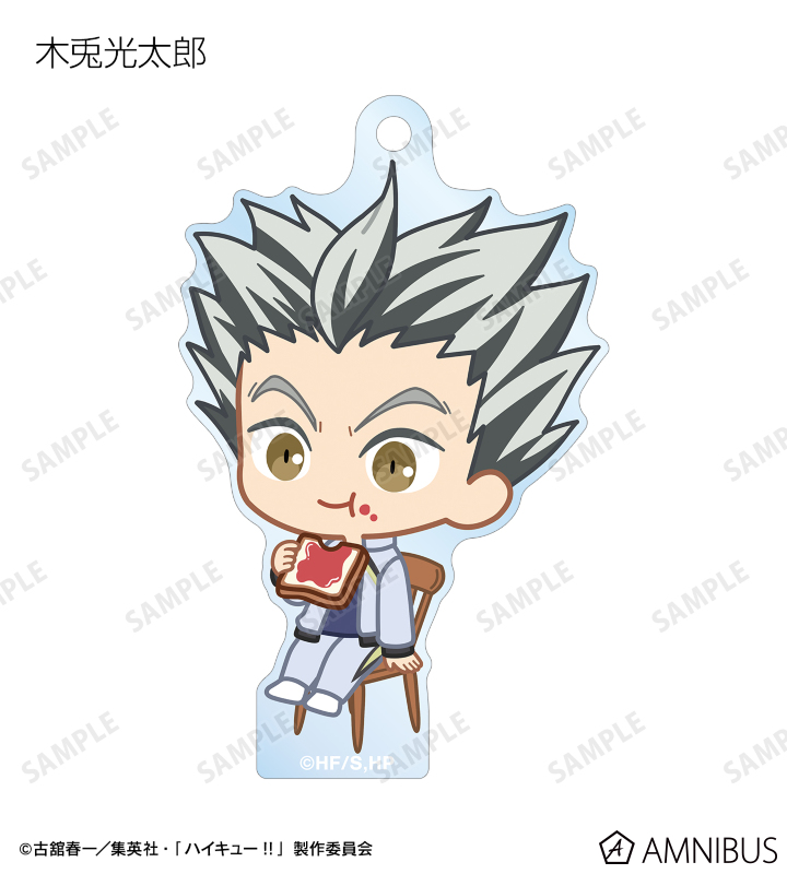 黒尾鉄朗、孤爪研磨、木兎光太郎、赤葦京治、宮 侑、宮 治、北 信介、角名倫太郎の描き起こしちびキャラビジュアルをメインにデザインし、アクリルキーホルダーに仕上げました。