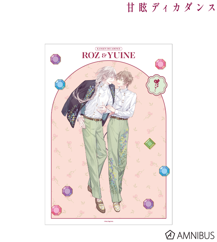 緋汰しっぷ先生描き下ろしイラストのロズ、ユイネをお花と宝石風の飾りと組み合わせ、A3サイズのマット加工されたポスターに仕上げました。