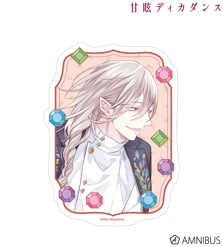 緋汰しっぷ先生描き下ろしイラストのロズをお花と宝石風の飾りと組み合わせ、ダイカットのステッカーに仕上げました。
