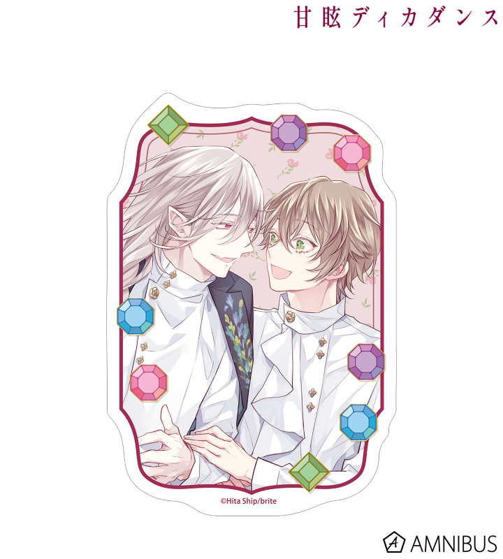 緋汰しっぷ先生描き下ろしイラストのロズ、ユイネをお花と宝石風の飾りと組み合わせ、ダイカットのステッカーに仕上げました。
