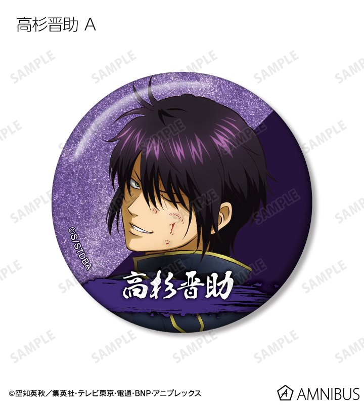 坂田銀時、志村新八、神楽、近藤勲、土方十四郎、沖田総悟、桂小太郎、高杉晋助、神威の描き下ろしイラストをグリッター加工を施した缶バッジに仕上げました。