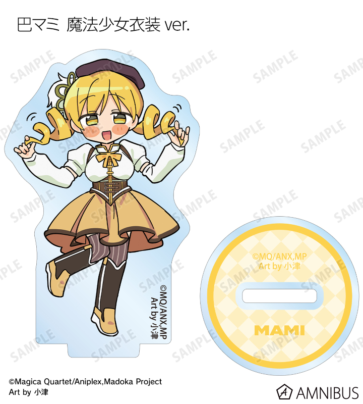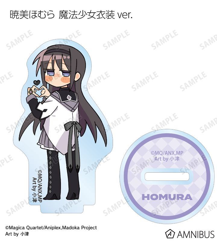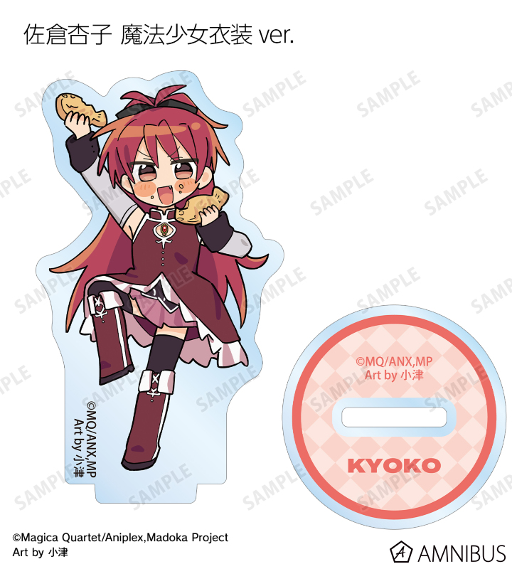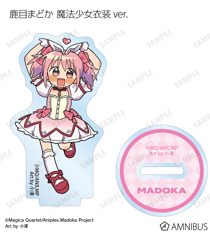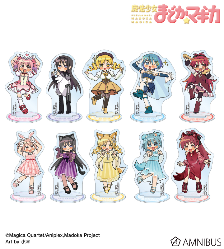 小津さん描き起こしちびキャライラストの鹿目まどか、暁美ほむら、巴マミ、美樹さやか、佐倉杏子をメインにデザインし、アクリルスタンドに仕上げました。