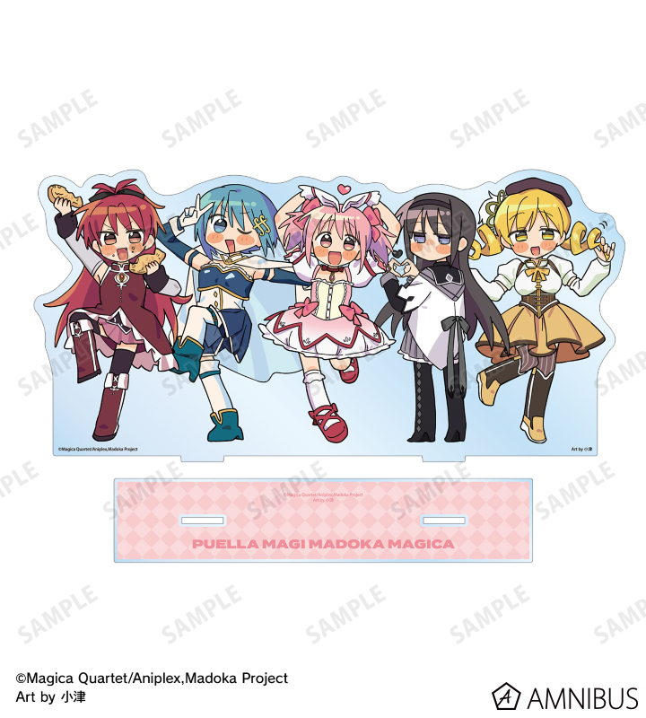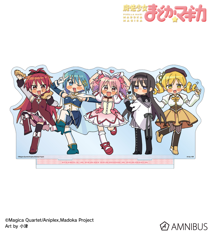 小津さん描き起こしちびキャライラストの鹿目まどか、暁美ほむら、巴マミ、美樹さやか、佐倉杏子をメインにデザインし、BIGなアクリルスタンドに仕上げました。
