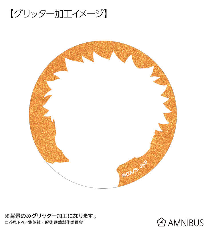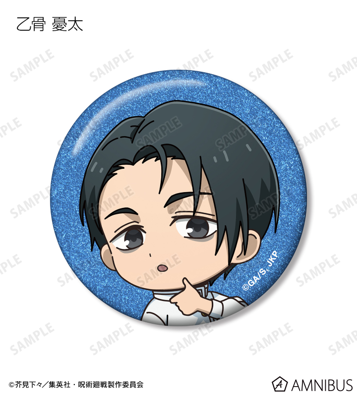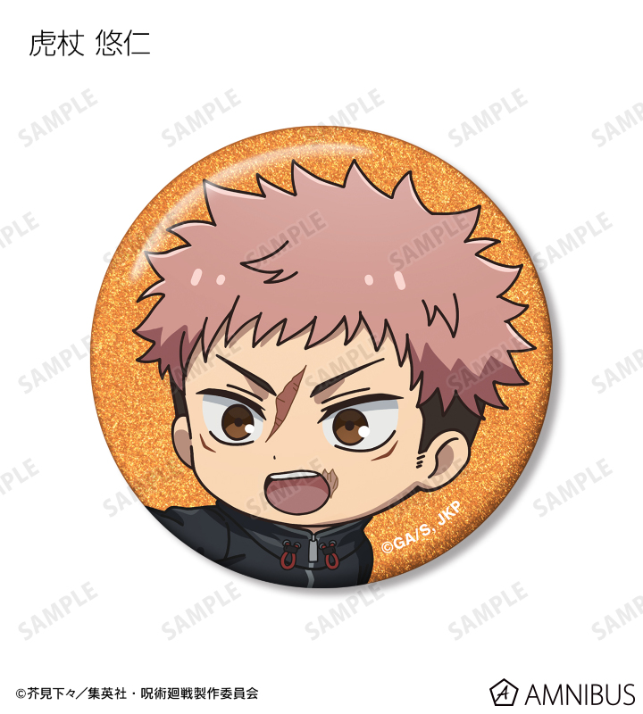 虎杖 悠仁、伏黒 恵、乙骨 憂太、脹相、禪院 直哉、夏油 傑、宿儺の描き起こしちびキャライラストをメインにデザインし、グリッター加工を施した缶バッジに仕上げました。