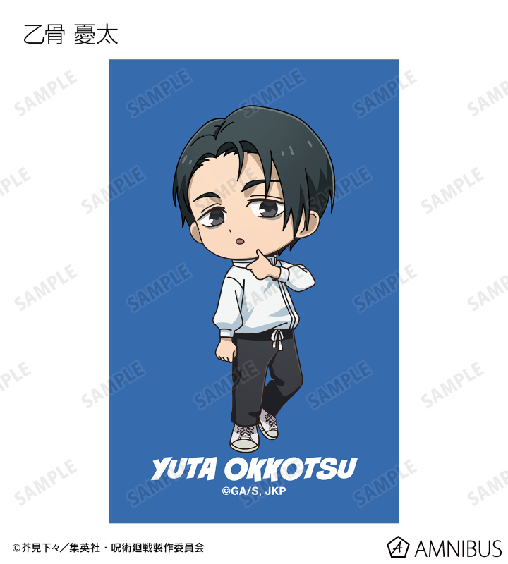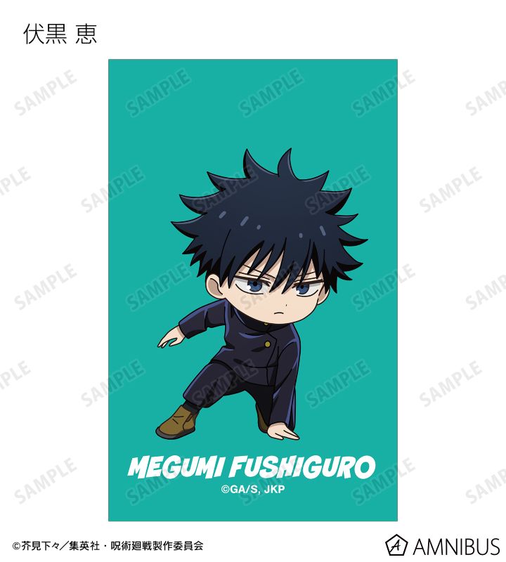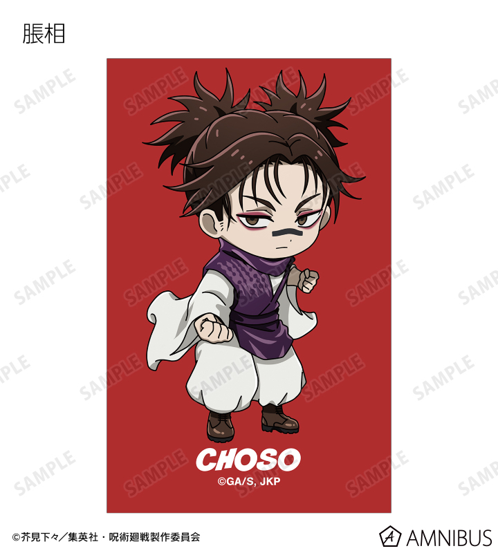 虎杖 悠仁、伏黒 恵、乙骨 憂太、脹相、禪院 直哉、夏油 傑、宿儺の描き起こしちびキャライラストをメインにデザインし、ビジュアルカードに仕上げました。