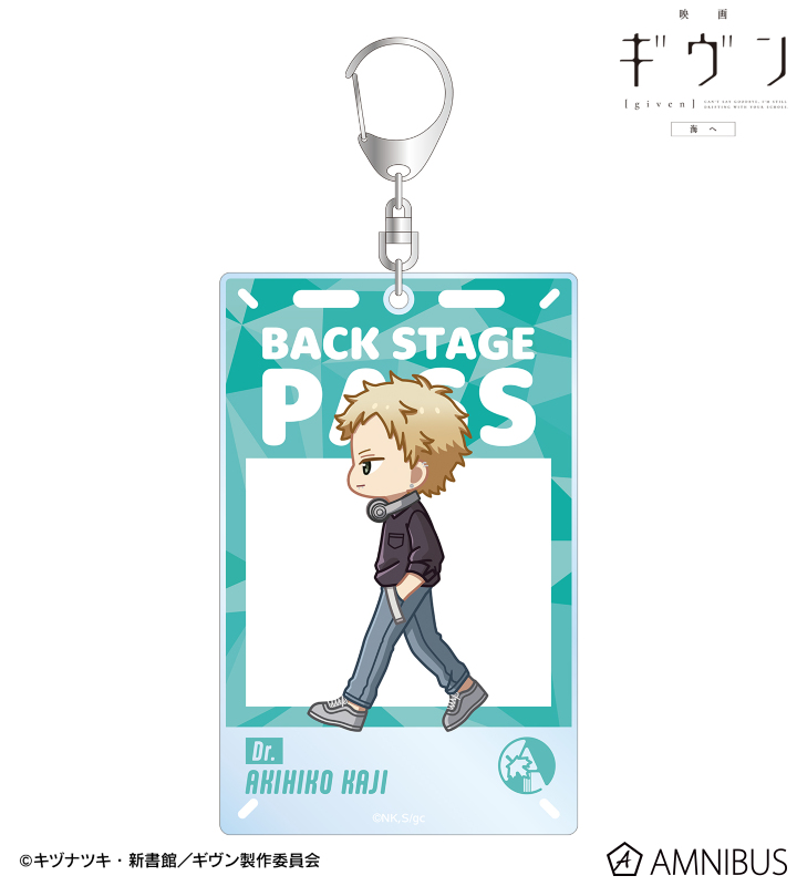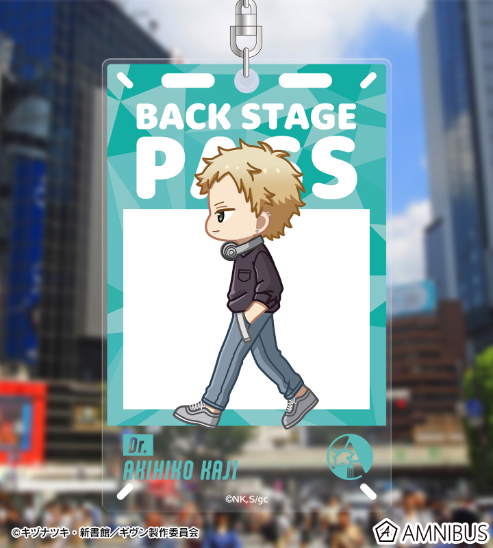 梶 秋彦が歩いているちびキャラを新たに描き起こし、バックステージパス風のBIGなアクリルキーホルダーに仕上げました。