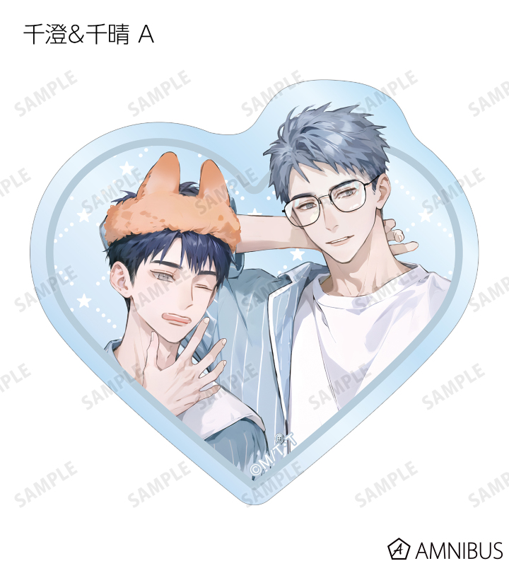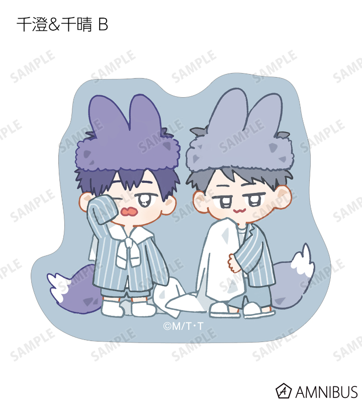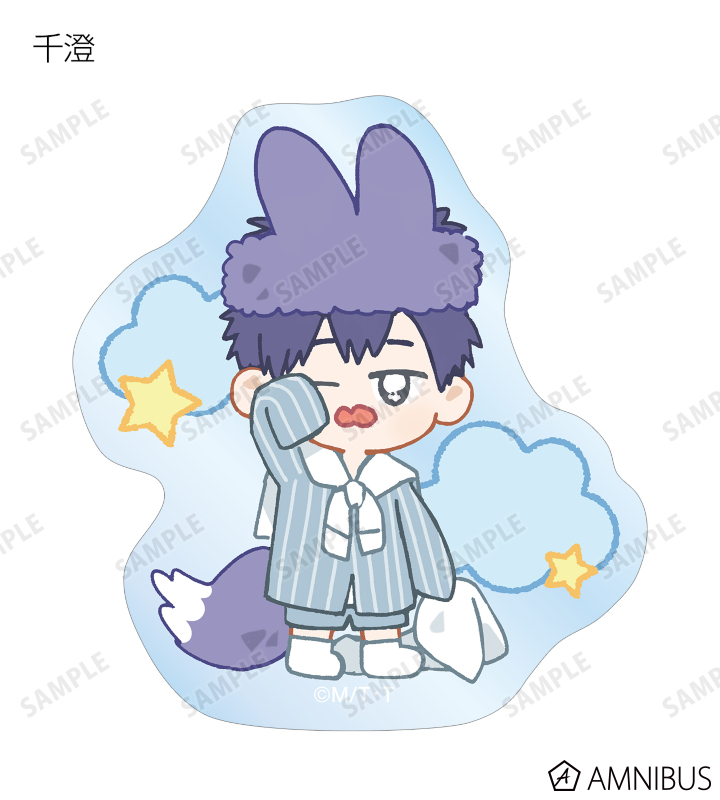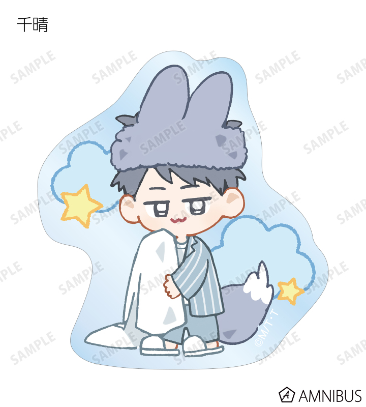 MAE先生描き下ろしイラスト、ちびキャライラストの千澄、千晴、陸野 延賀、景山 侑をダイカットのクリアステッカーに仕上げました。
