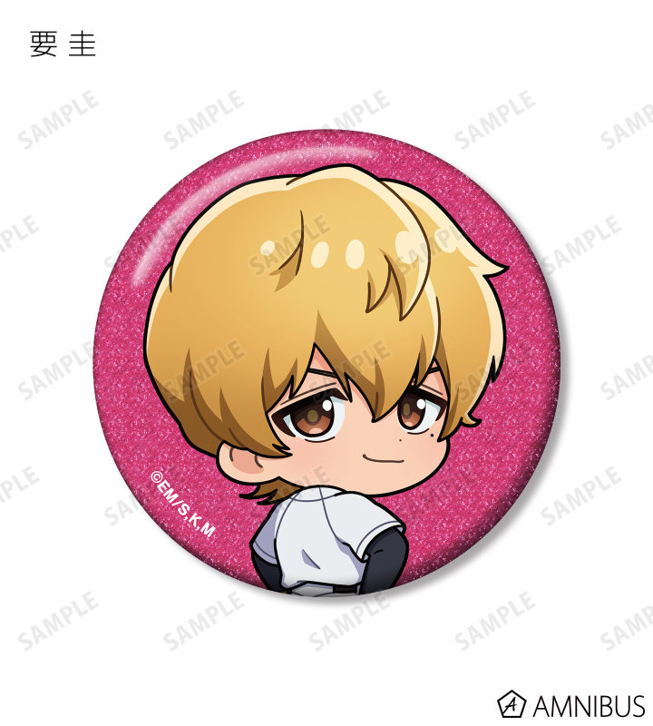 清峰葉流火、要 圭、山田太郎の描き起こしちびキャライラストをメインにデザインし、グリッター加工を施した缶バッジ3個セットに仕上げました。