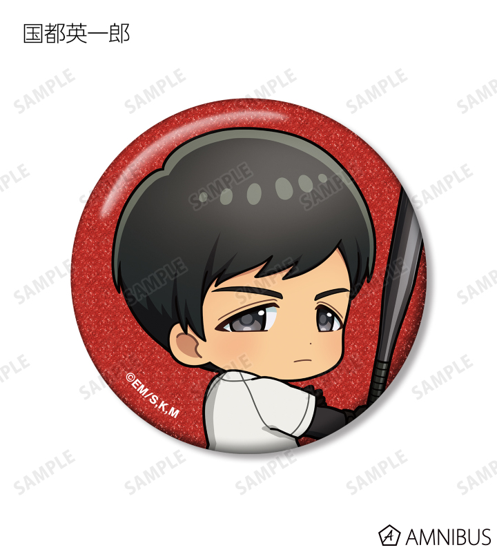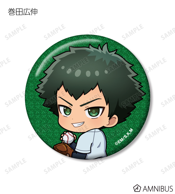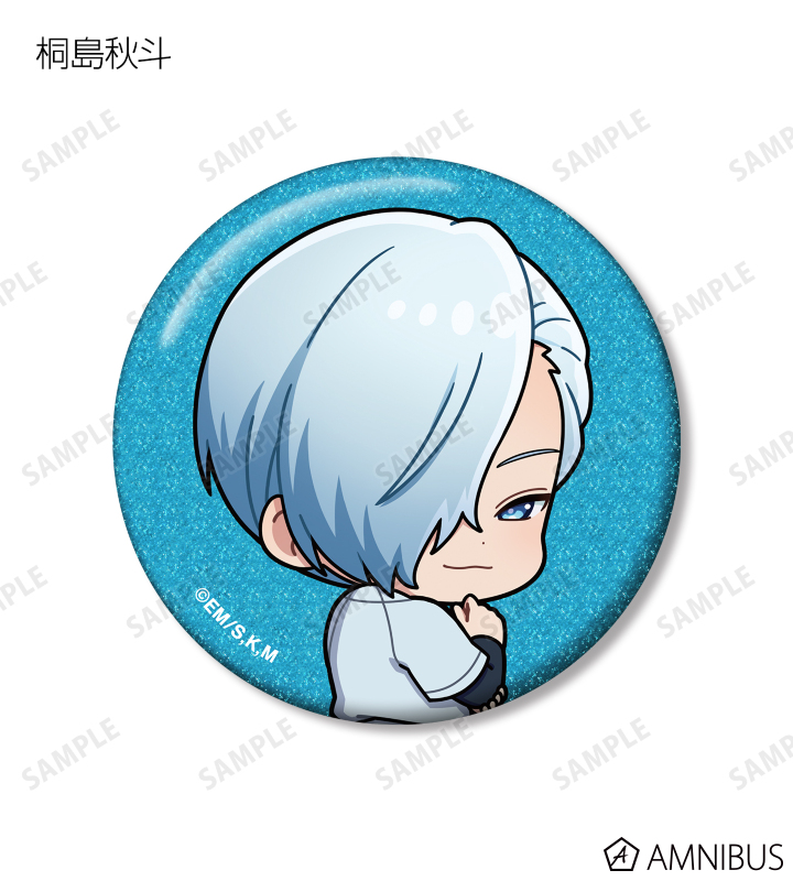 国都英一郎、巻田広伸、桐島秋斗の描き起こしちびキャライラストをメインにデザインし、グリッター加工を施した缶バッジ3個セットに仕上げました。