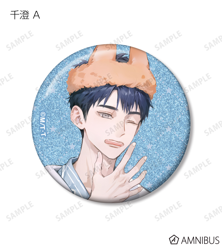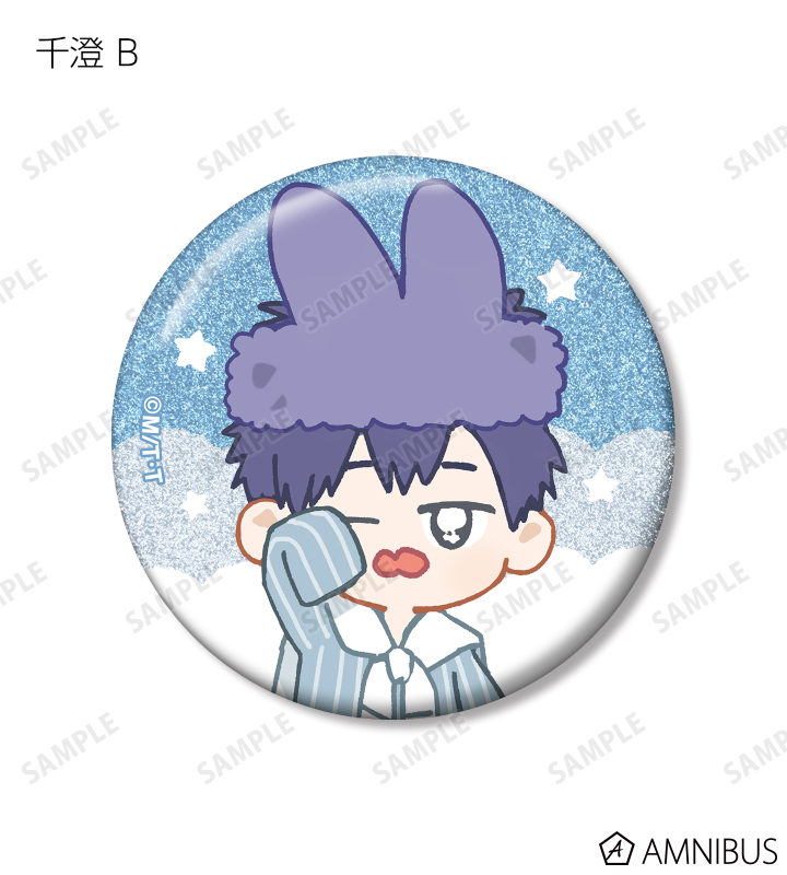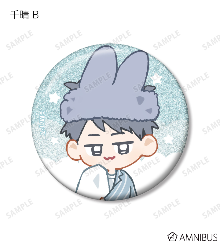 MAE先生描き下ろしイラスト、ちびキャライラストの千澄、千晴、陸野 延賀、景山 侑をグリッター加工を施した缶バッジに仕上げました。