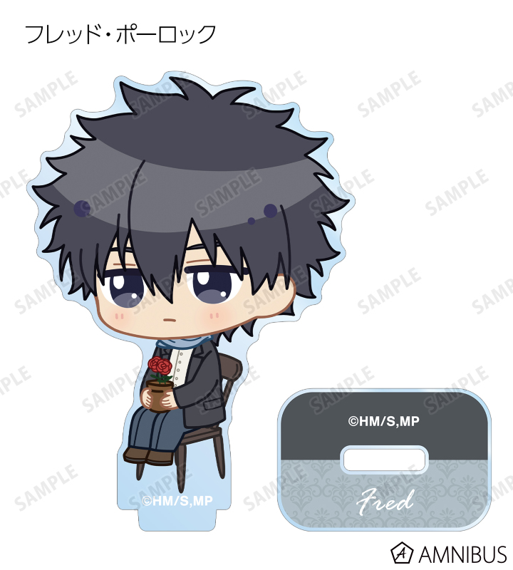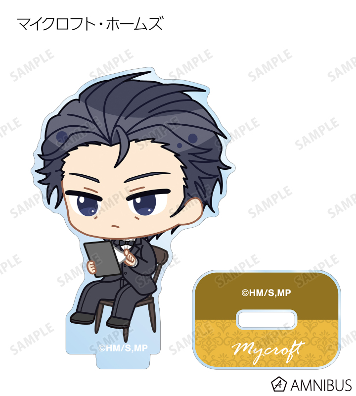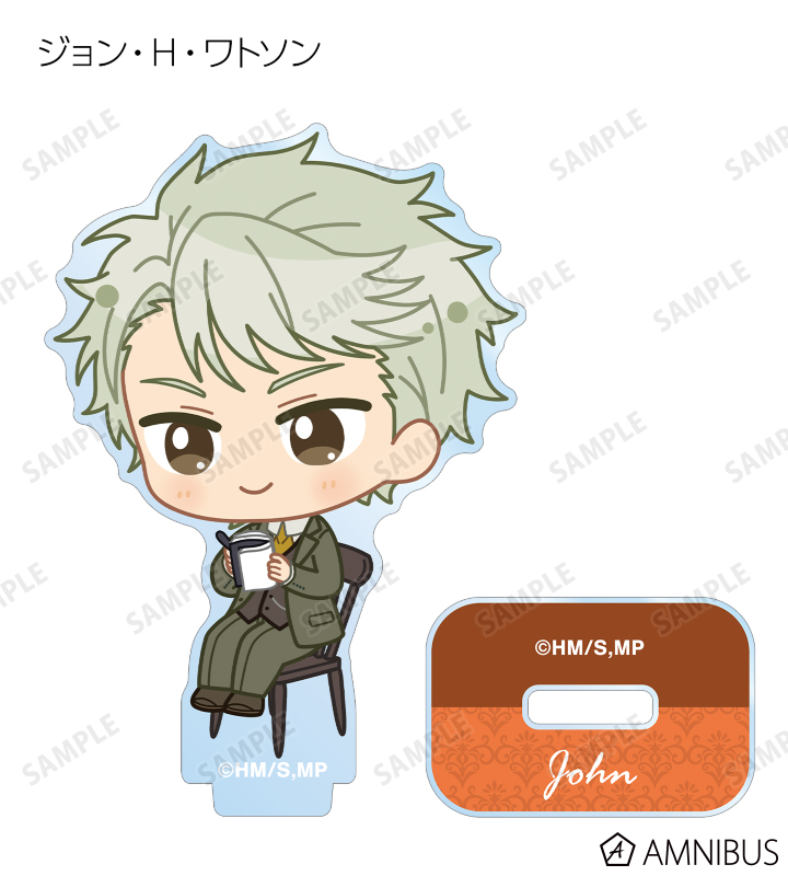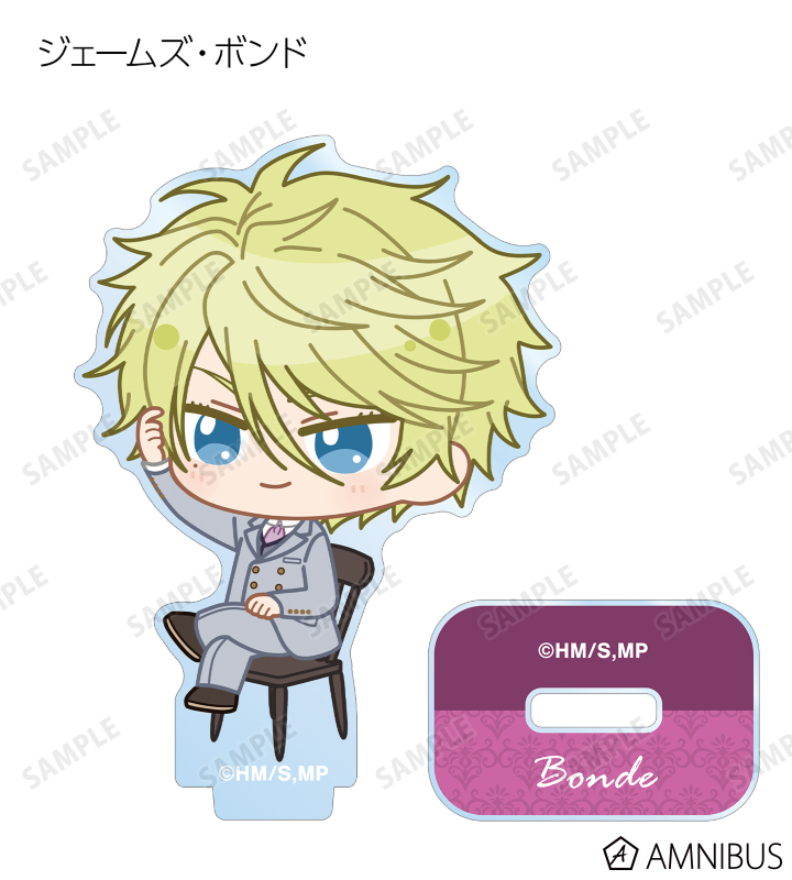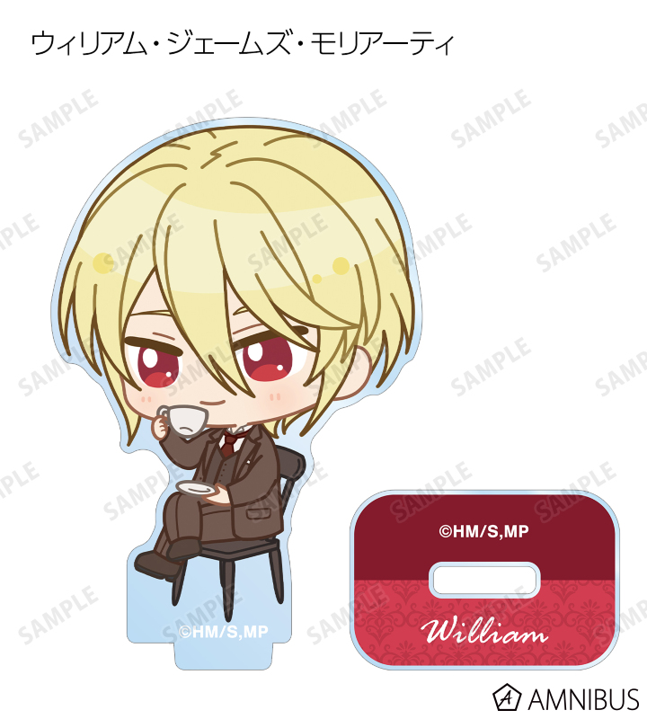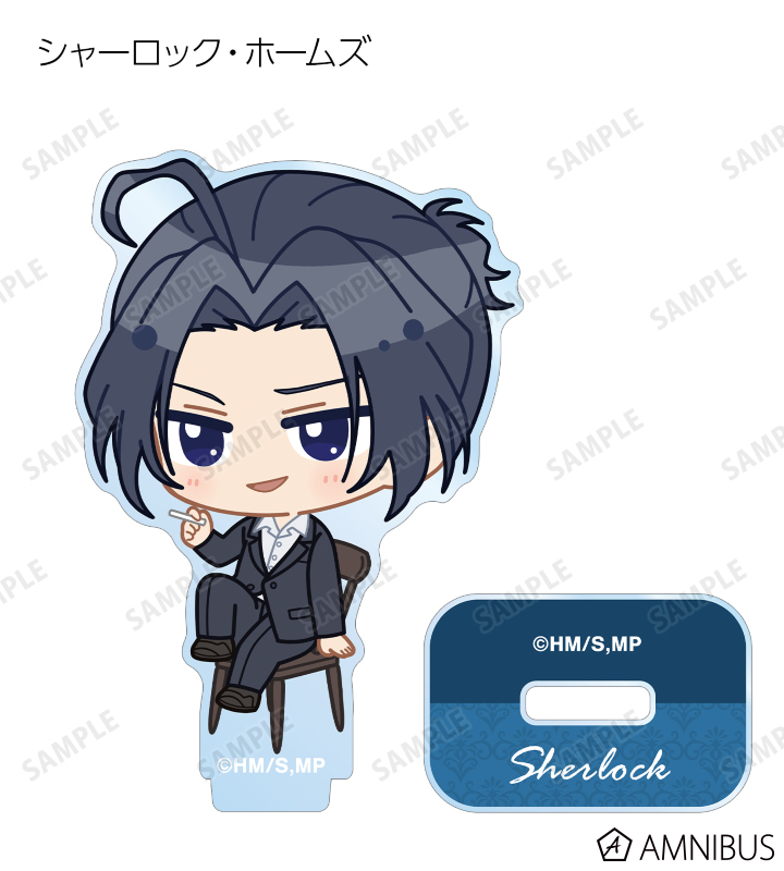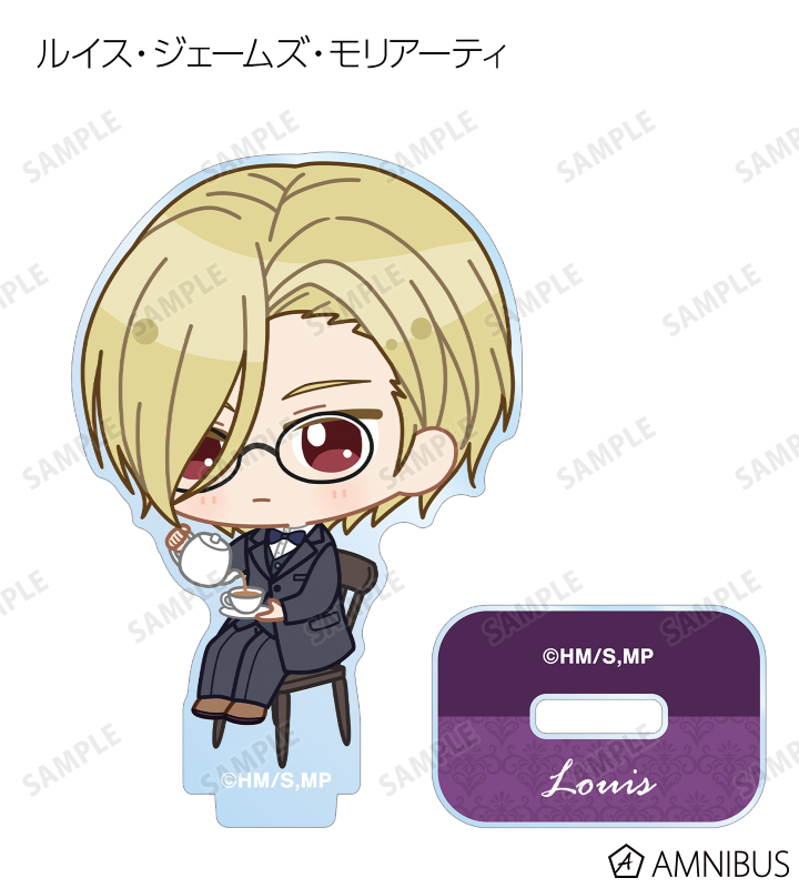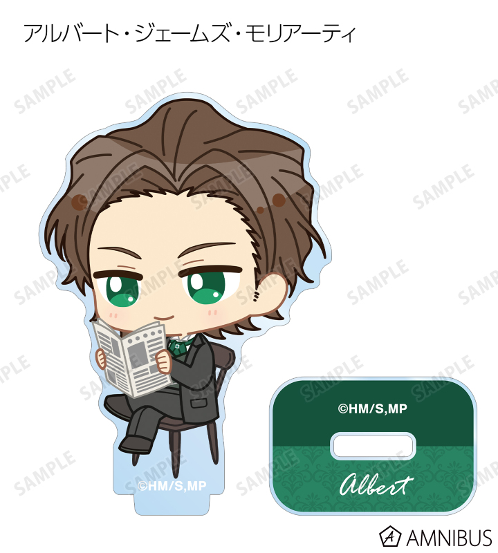 ウィリアム・ジェームズ・モリアーティ、アルバート・ジェームズ・モリアーティ、ルイス・ジェームズ・モリアーティ、セバスチャン・モラン、フレッド・ポーロック、ジェームズ・ボンド、シャーロック・ホームズ、ジョン・H・ワトソン、マイクロフト・ホームズの描き起こしちびキャライラストをメインにデザインし、アクリルスタンドに仕上げました。