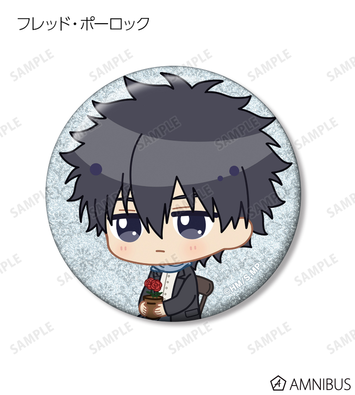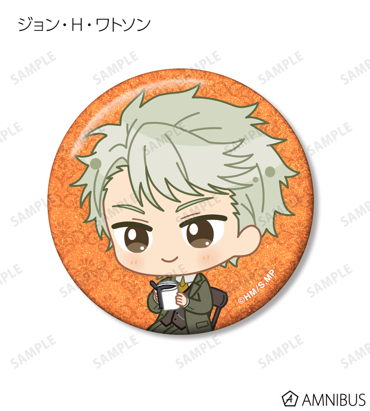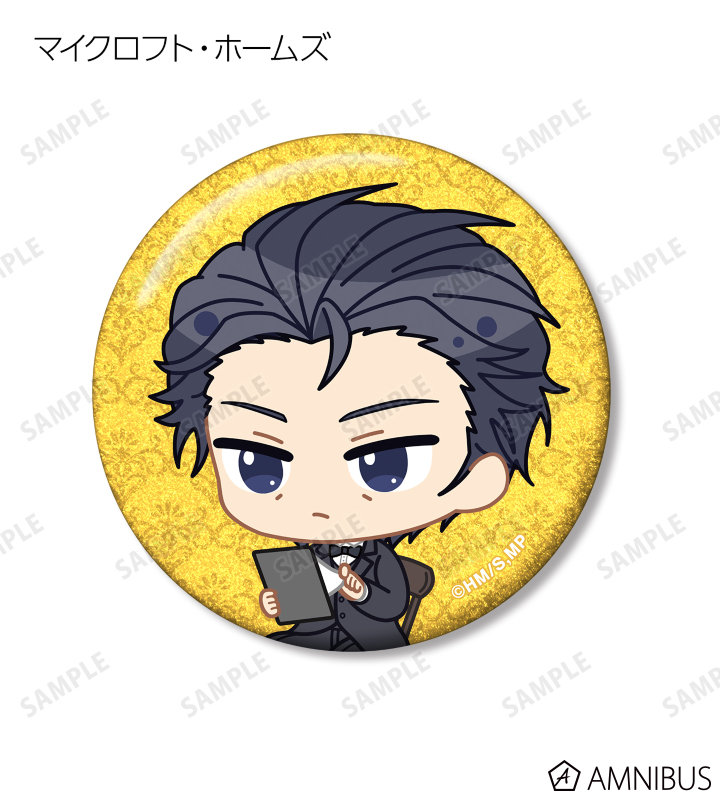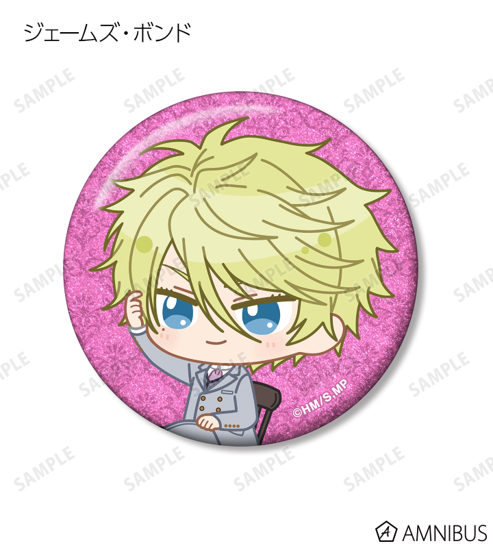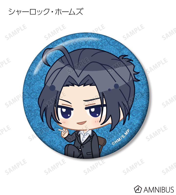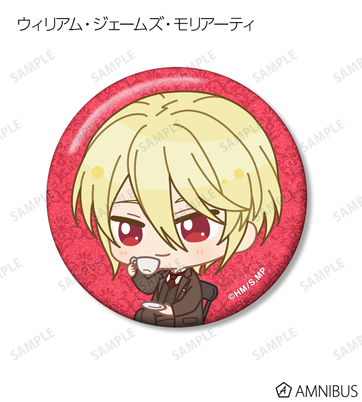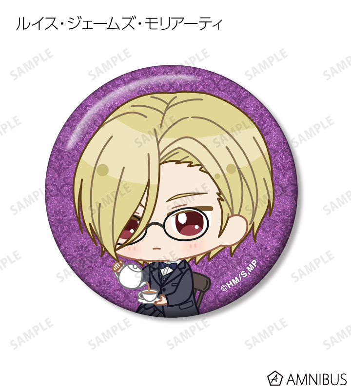 ウィリアム・ジェームズ・モリアーティ、アルバート・ジェームズ・モリアーティ、ルイス・ジェームズ・モリアーティ、セバスチャン・モラン、フレッド・ポーロック、ジェームズ・ボンド、シャーロック・ホームズ、ジョン・H・ワトソン、マイクロフト・ホームズの描き起こしちびキャライラストをメインにデザインし、グリッター加工を施した缶バッジに仕上げました。