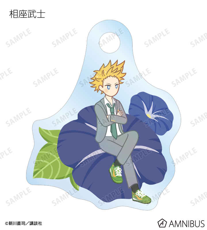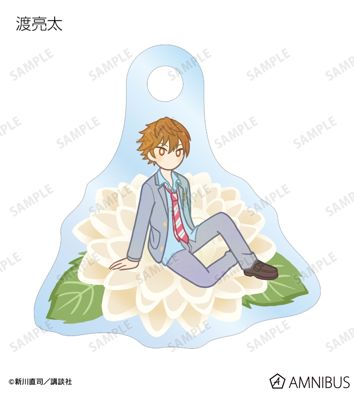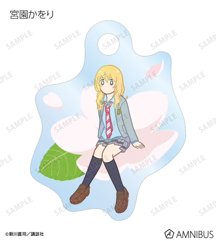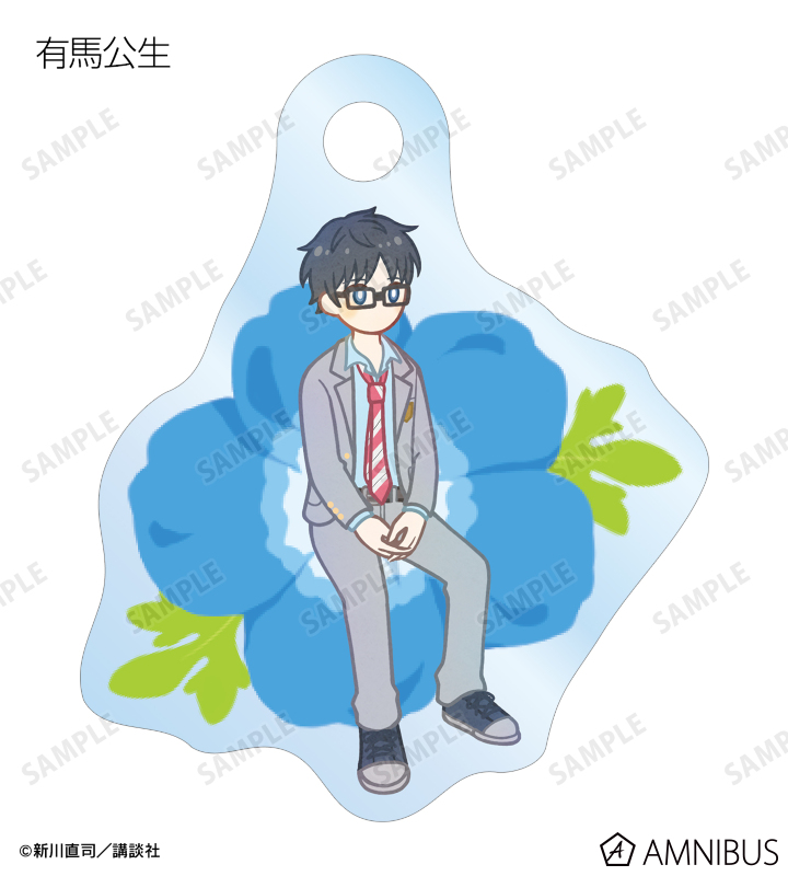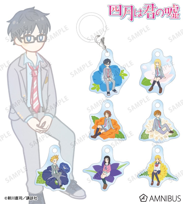有馬公生、宮園かをり、澤部椿、渡亮太、相座武士、井川絵見、相座凪のイラストをボタニカルデザインに落とし込んで繊細なタッチで新たに描き起こし、ダイカットのアクリルチャームに仕上げました。