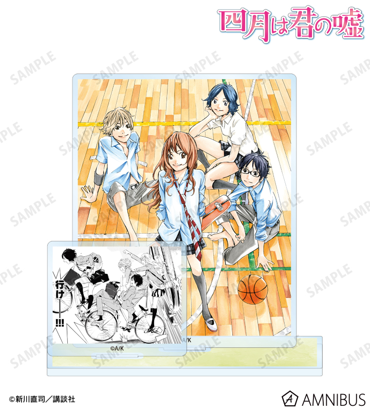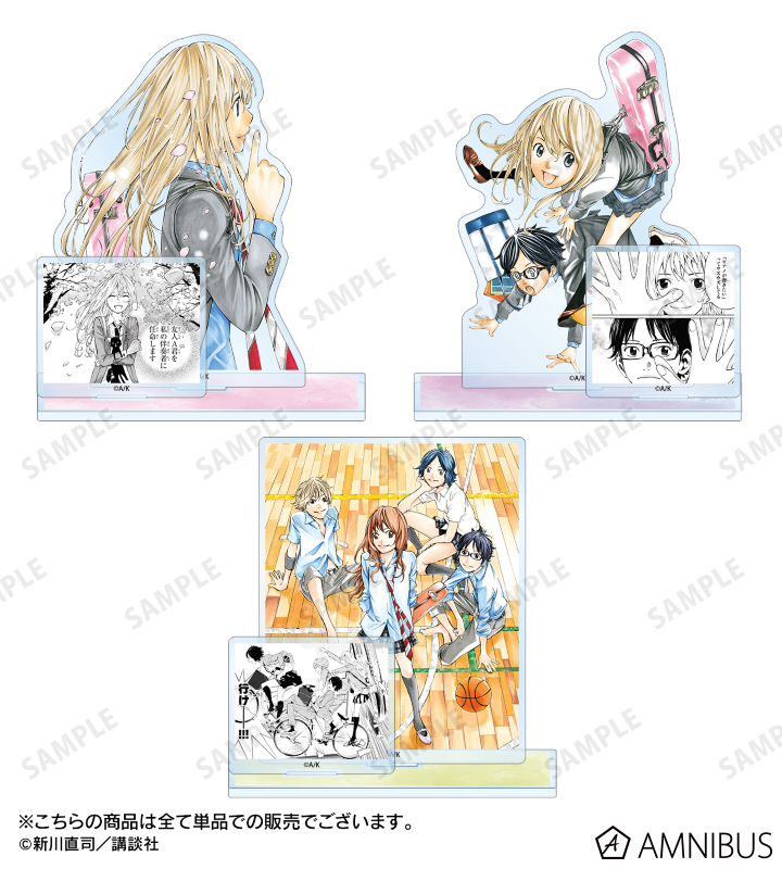 有馬公生、宮園かをり、澤部椿、渡亮太のカラーイラスト、原作コマイラストをパーツ付きのBIGなアクリルスタンドに仕上げました。