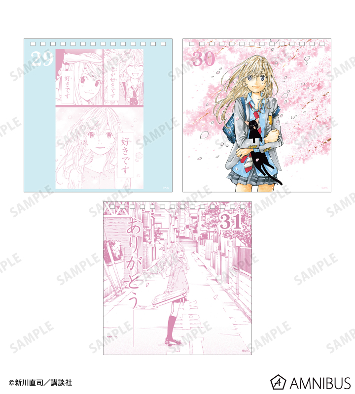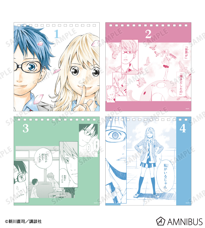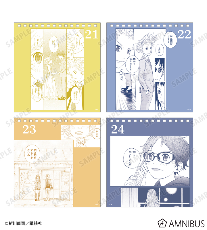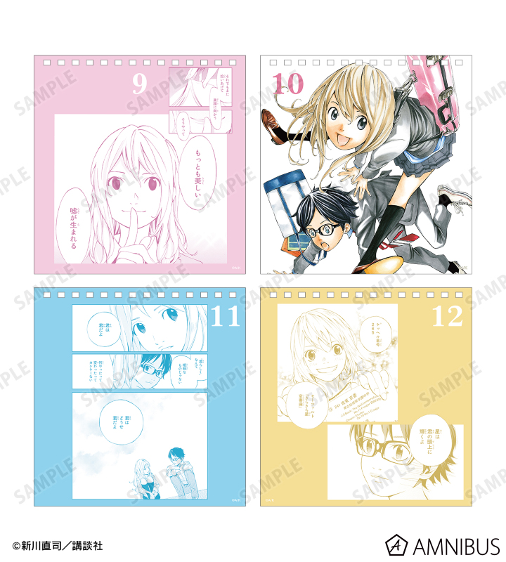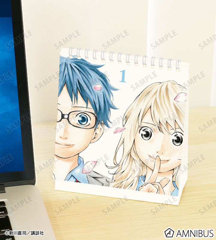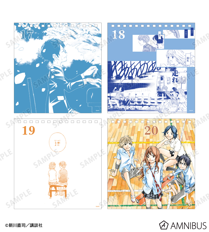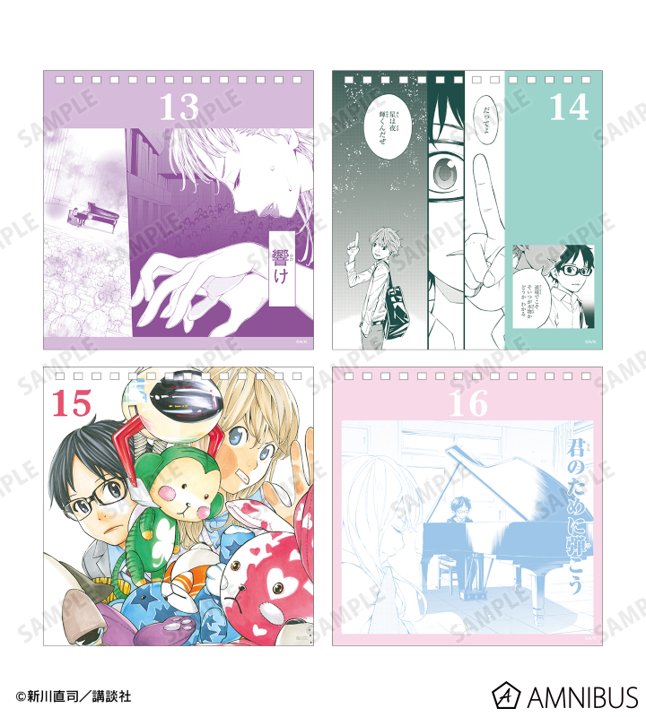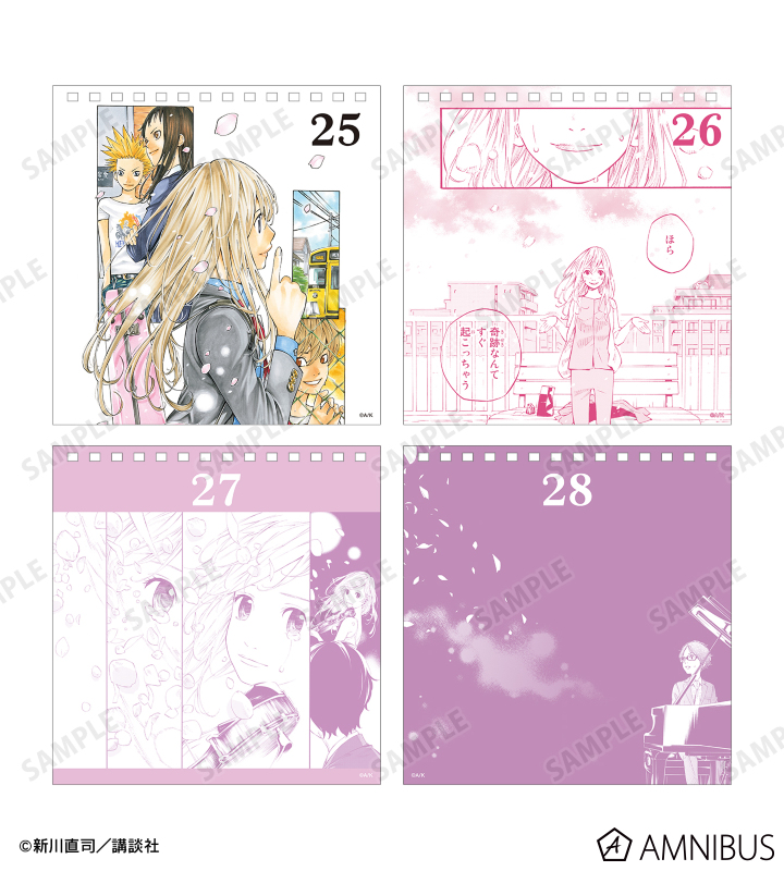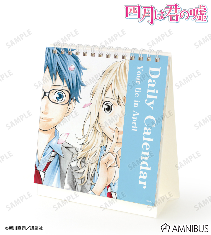有馬公生、宮園かをり、澤部椿、渡亮太、相座武士、井川絵見、相座凪の原作コマイラストを日替わりでお楽しみいただける日めくりカレンダーに仕上げました。