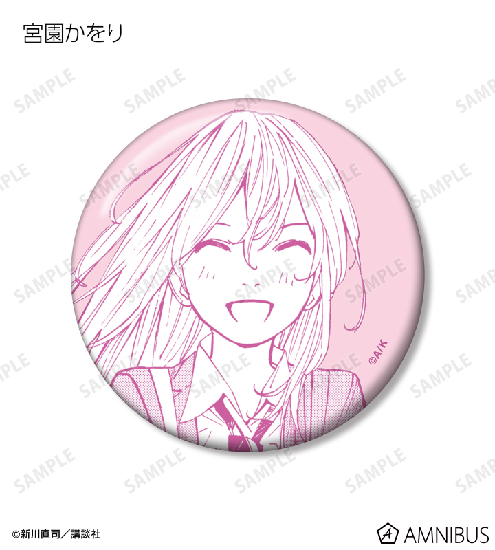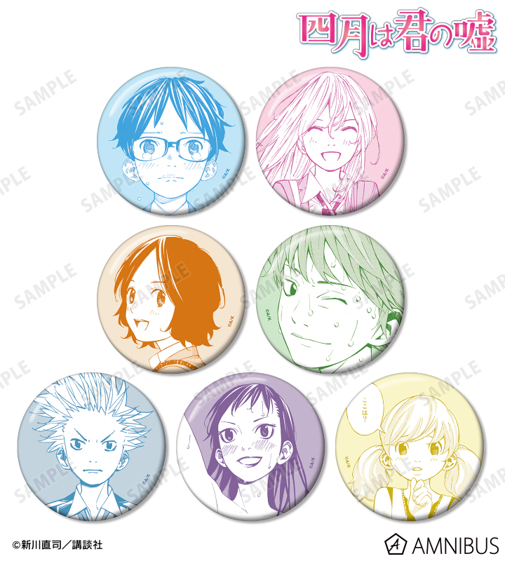 有馬公生、宮園かをり、澤部椿、渡亮太、相座武士、井川絵見、相座凪の原作コマイラストを缶バッジに仕上げました。