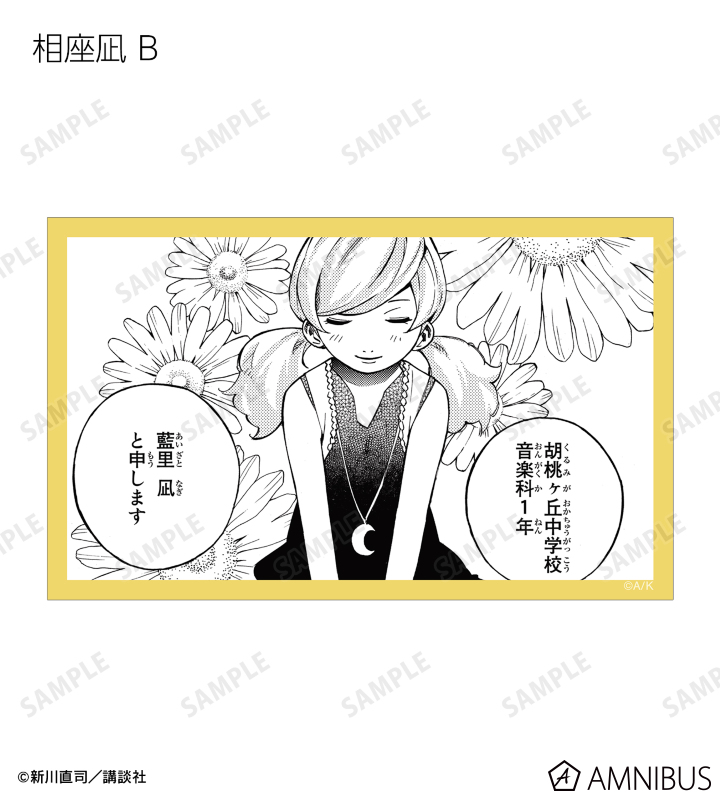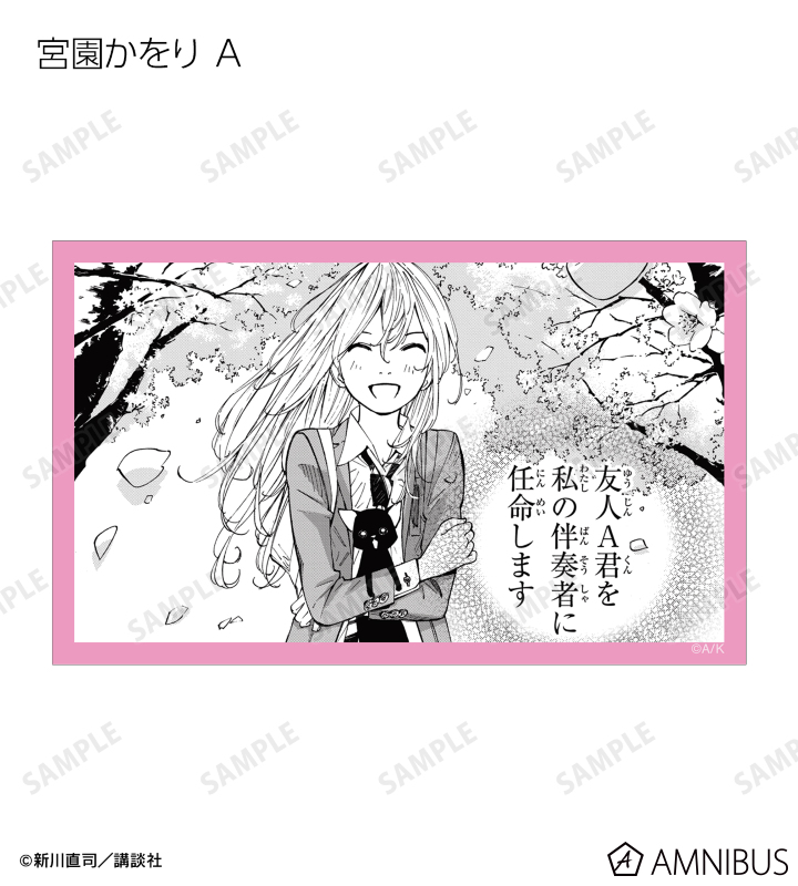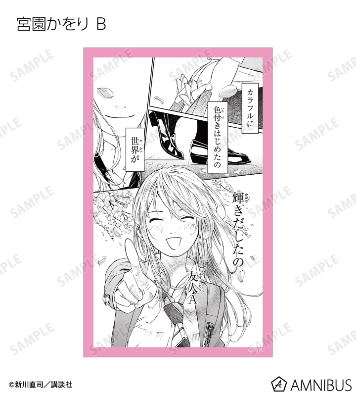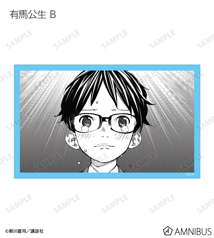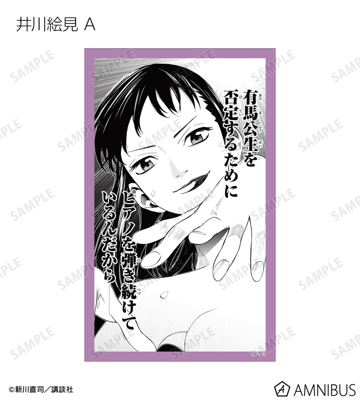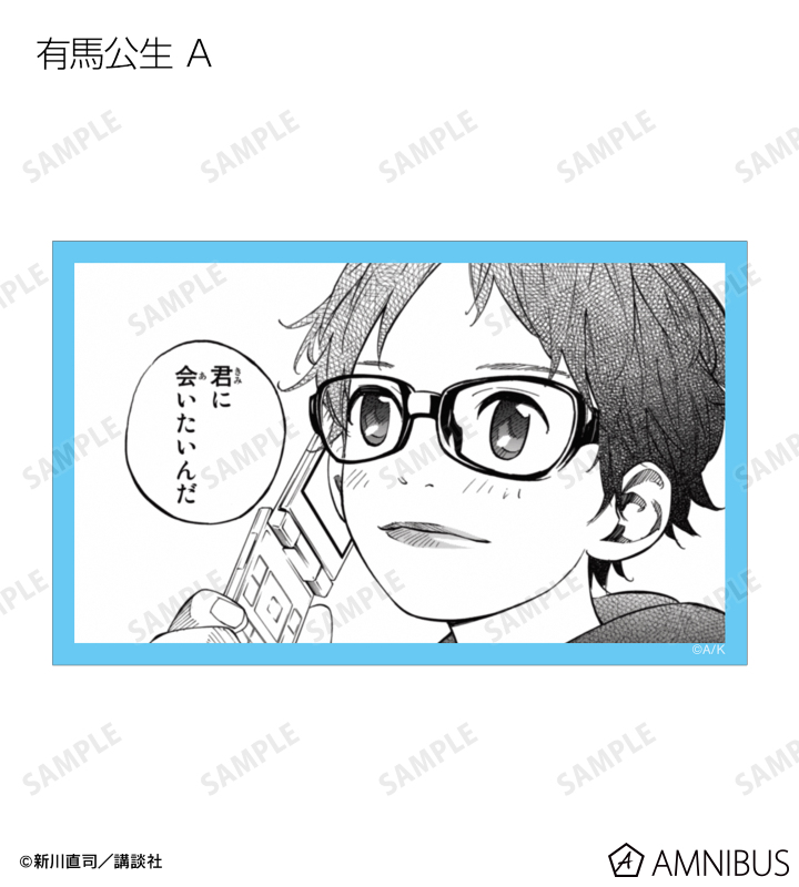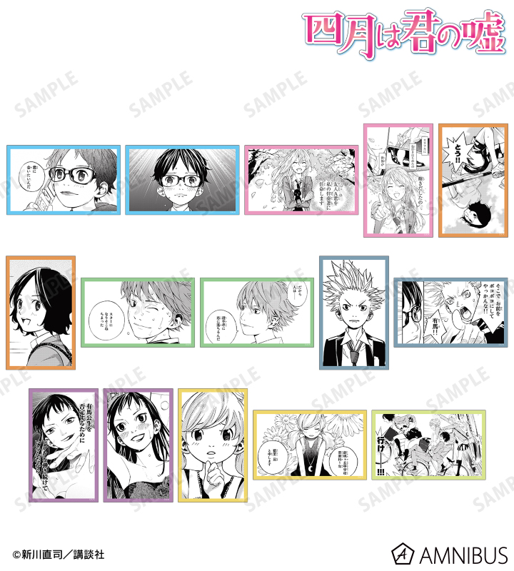 有馬公生、宮園かをり、澤部椿、渡亮太、相座武士、井川絵見、相座凪の原作コマイラストをクリアカードに仕上げました。