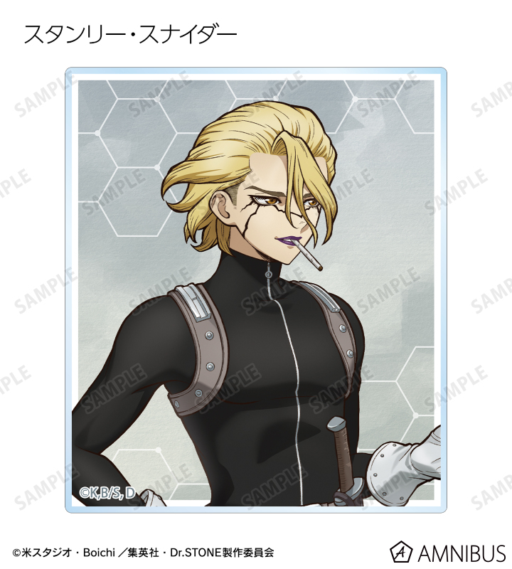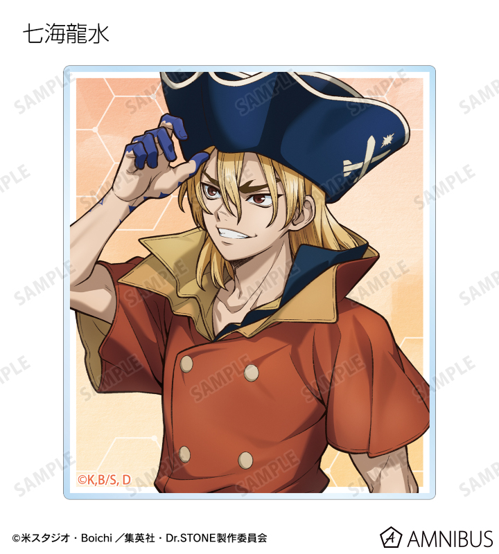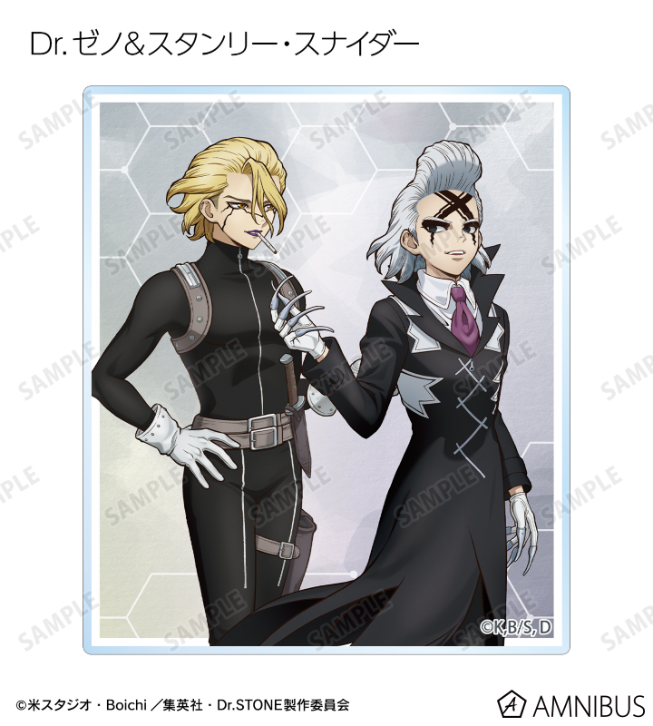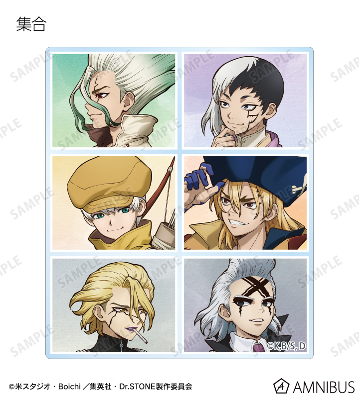 石神千空、あさぎりゲン、七海龍水、西園寺羽京、Dr.ゼノ、スタンリー・スナイダーの描き下ろしイラストをアクリルカードに仕上げました。