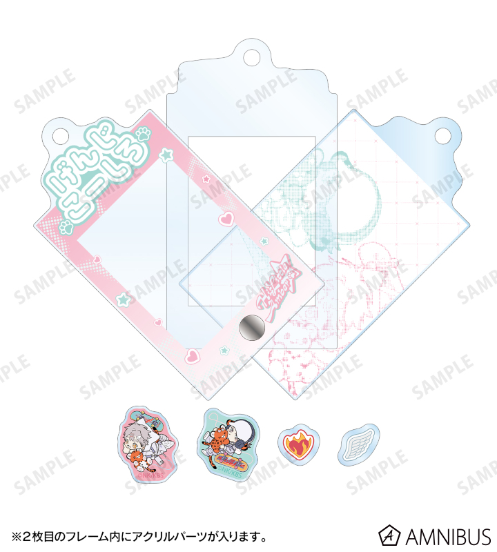 アクリルフレームの中に、ナツメカズキ先生描き下ろしちびキャライラストの琥士郎、源慈と小さなパーツが入っている、パーツ付きフレームアクリルチャームです。