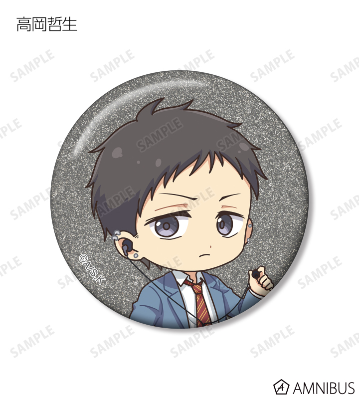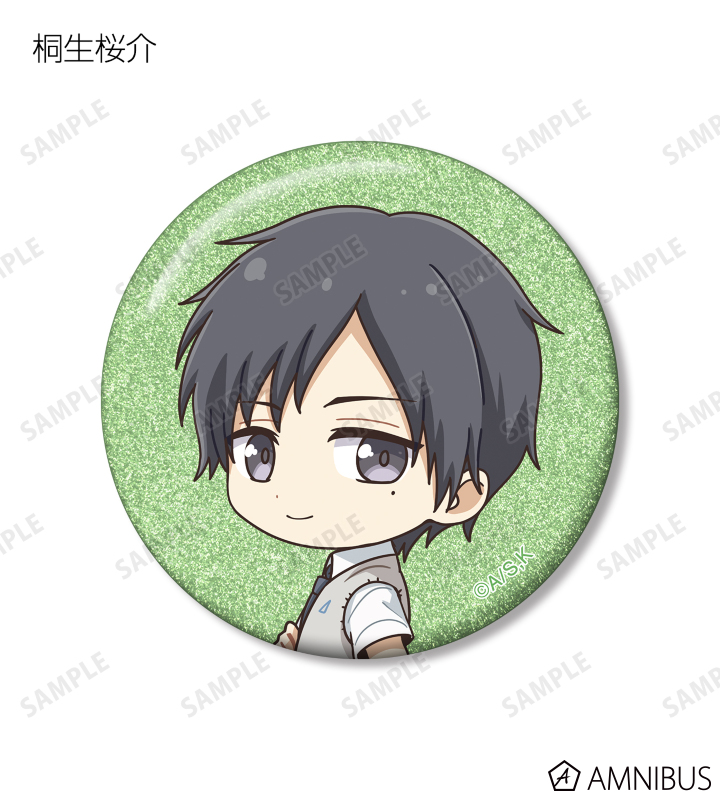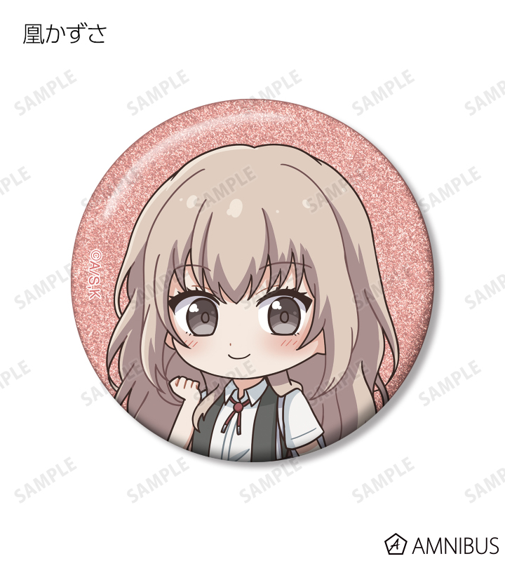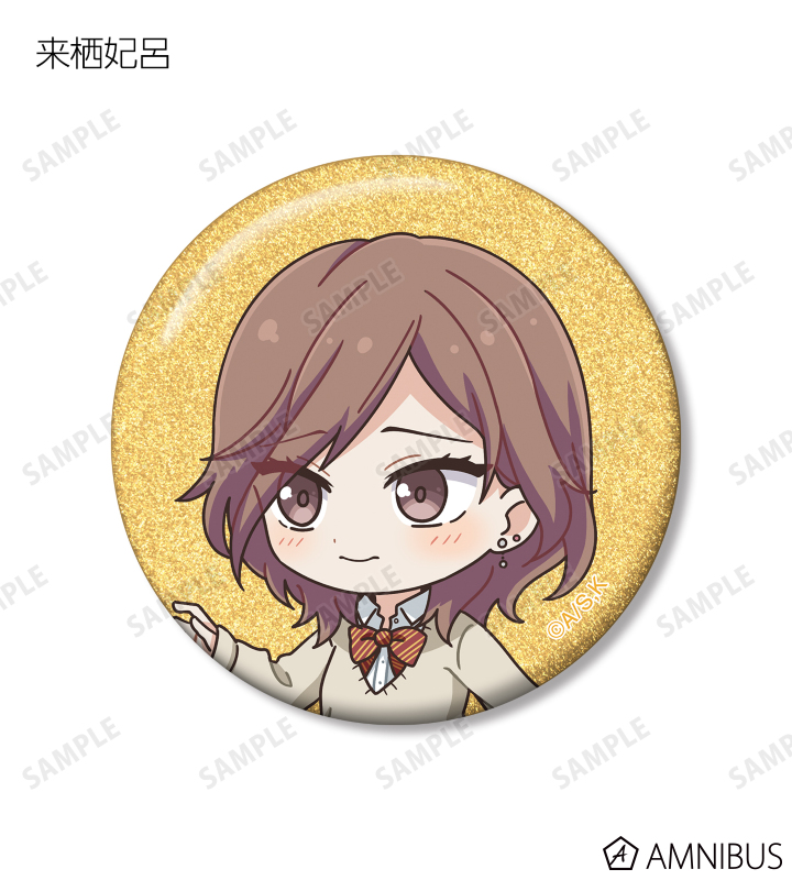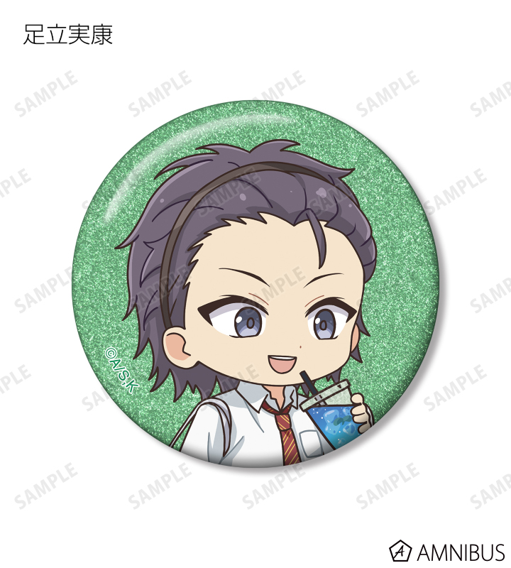 久遠 愛、倉田武蔵、鳳月さとわ、高岡哲生、足立実康、堺 通孝、水原光太、来栖妃呂、滝浪涼香、凰かずさ、花村 史、桐生桜介、神崎澪、堂島 晶、堂島 慧士の描き起こしちびキャライラストをメインにデザインし、グリッター加工を施した缶バッジに仕上げました。