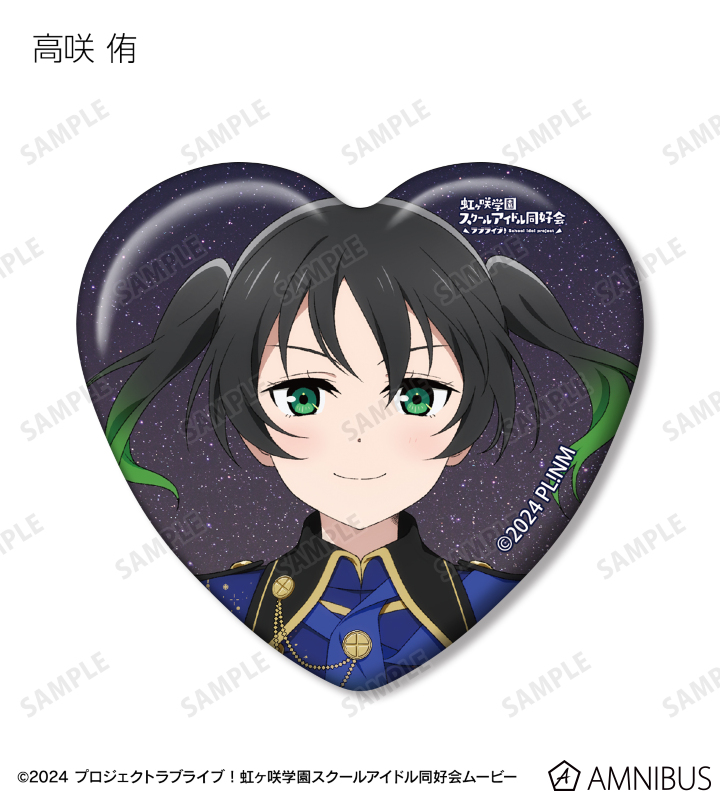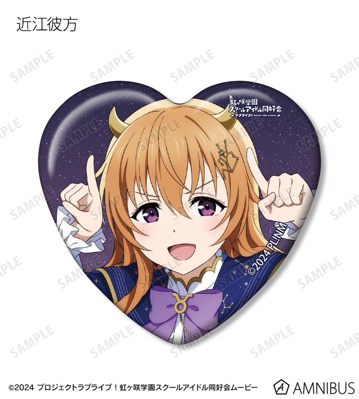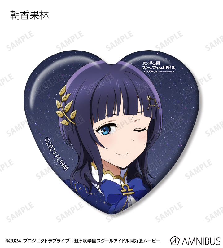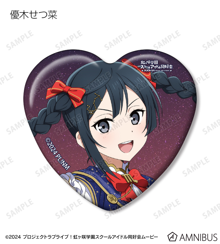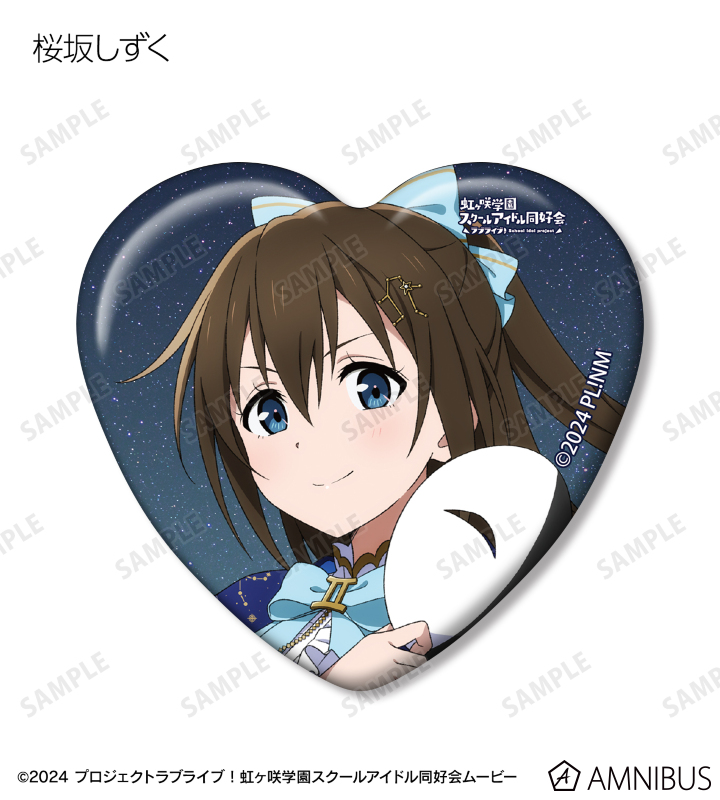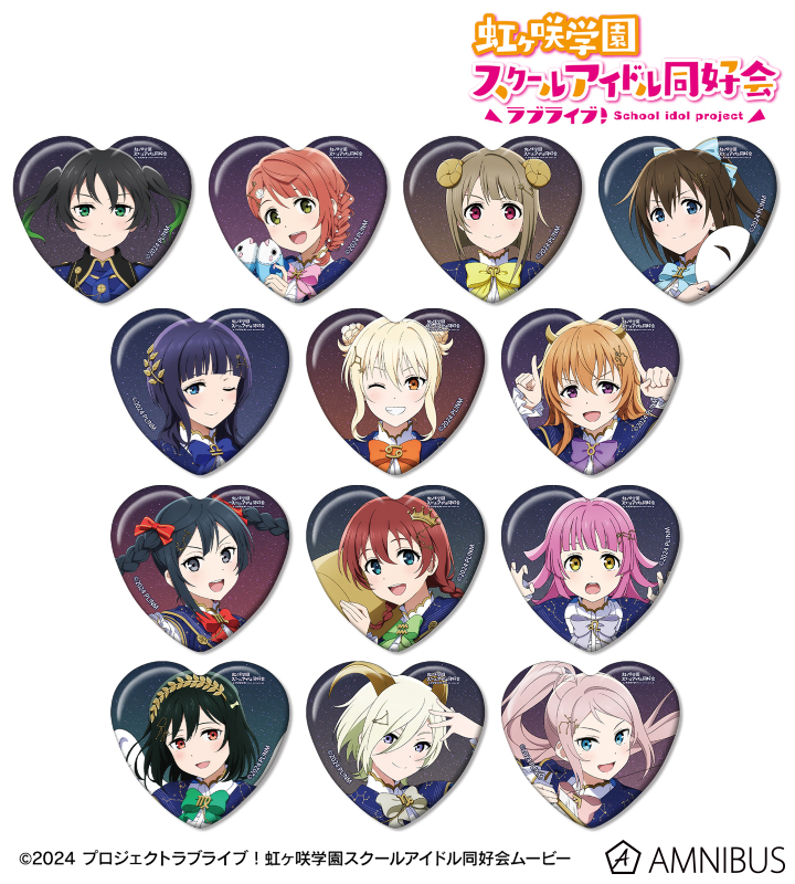 高咲 侑、上原歩夢、中須かすみ、桜坂しずく、朝香果林、宮下 愛、近江彼方、優木せつ菜、エマ・ヴェルデ、天王寺璃奈、三船栞子、ミア・テイラー、鐘 嵐珠の描き下ろしイラストをハート型の缶バッジに仕上げました。