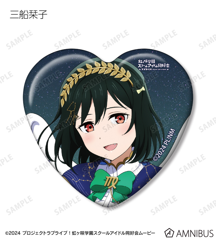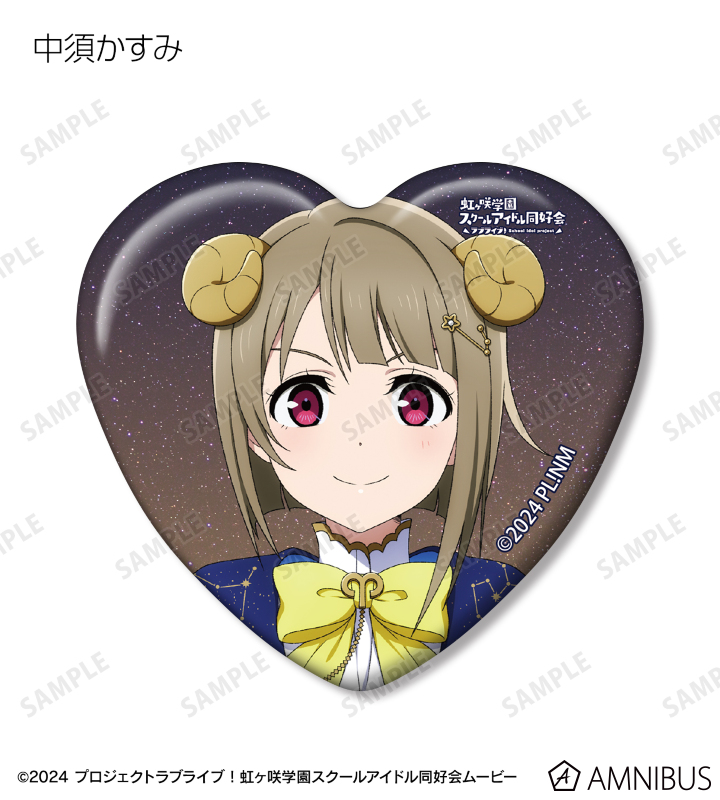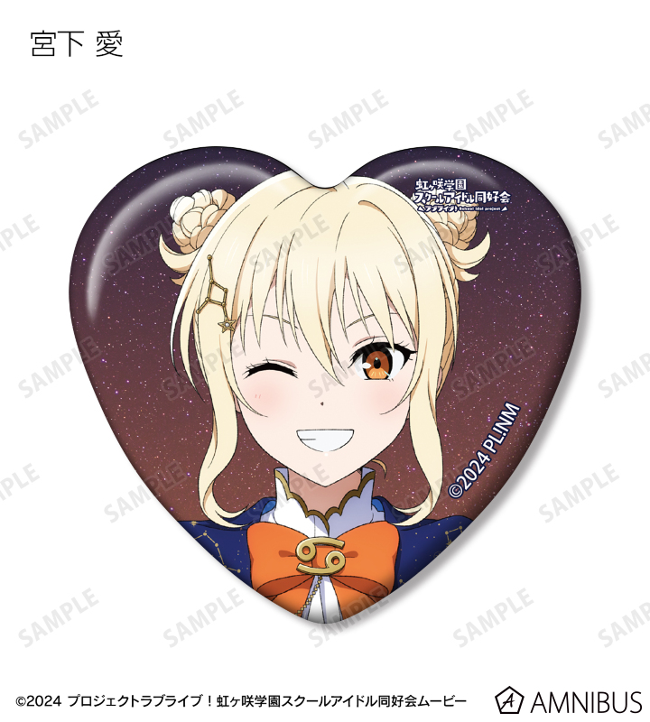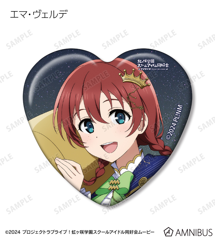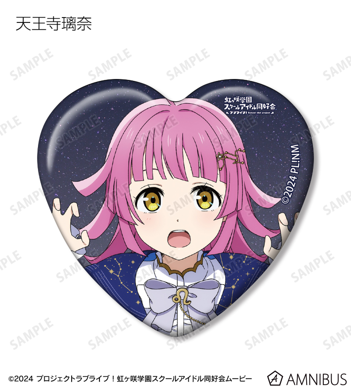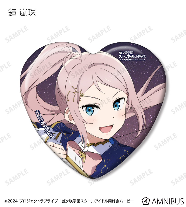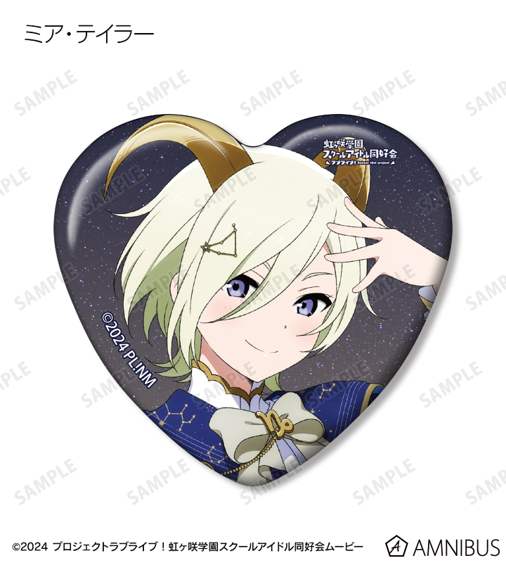 高咲 侑、上原歩夢、中須かすみ、桜坂しずく、朝香果林、宮下 愛、近江彼方、優木せつ菜、エマ・ヴェルデ、天王寺璃奈、三船栞子、ミア・テイラー、鐘 嵐珠の描き下ろしイラストをハート型の缶バッジに仕上げました。