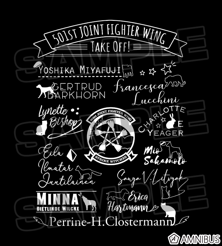 ウィッチの名前や使い魔のモチーフ、501部隊のロゴマークをレイアウトし、線画をメインとしたデザインで表現しました