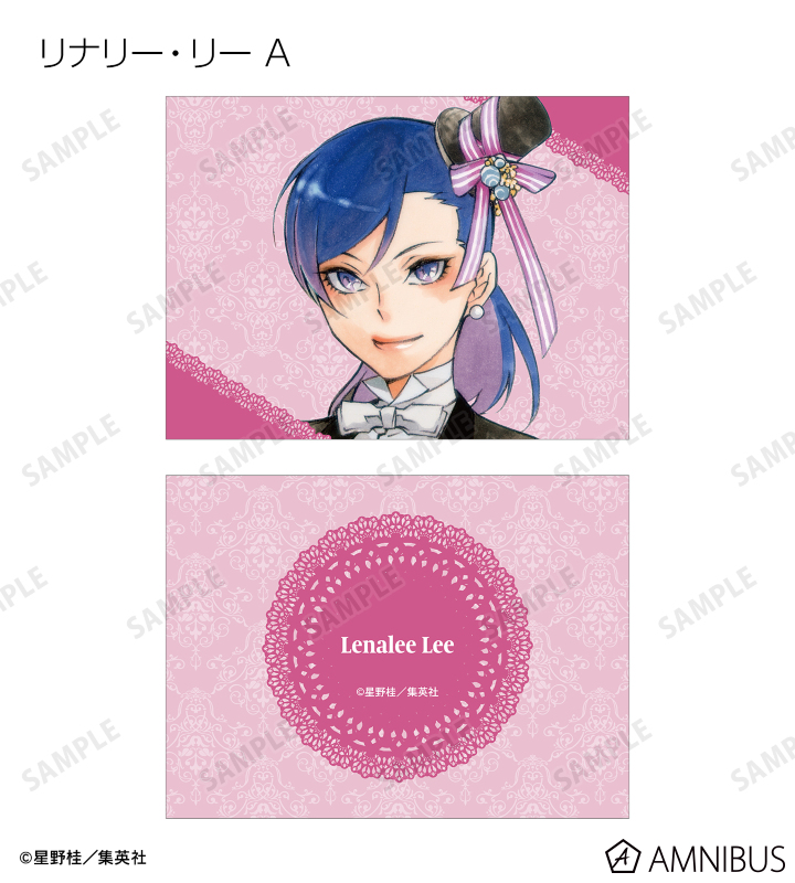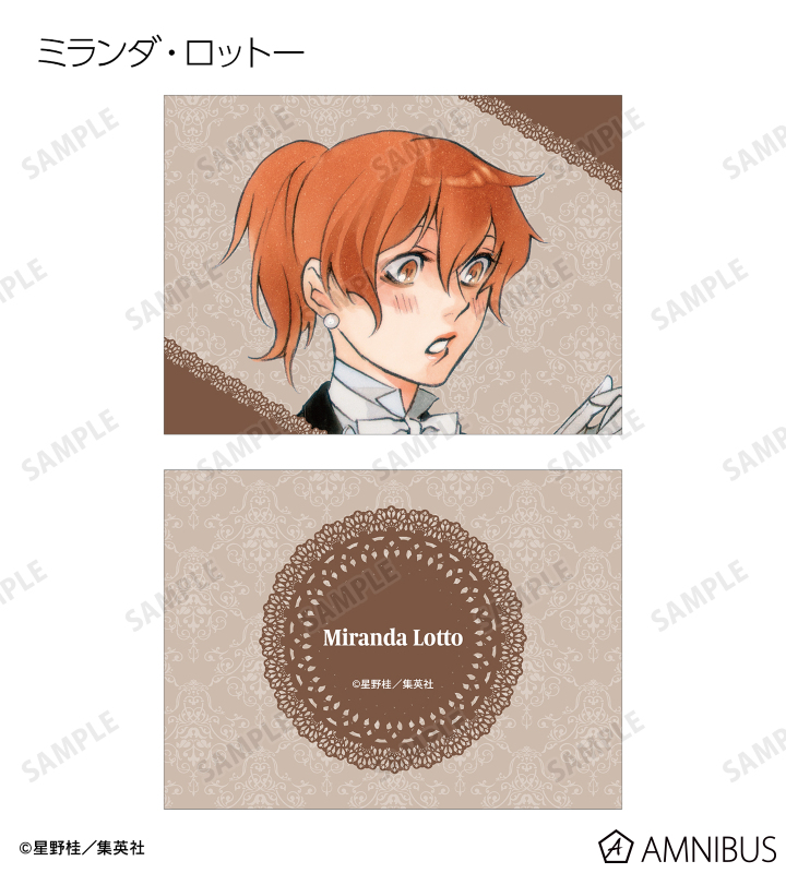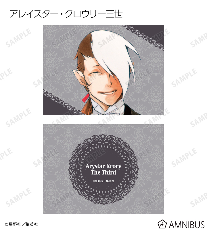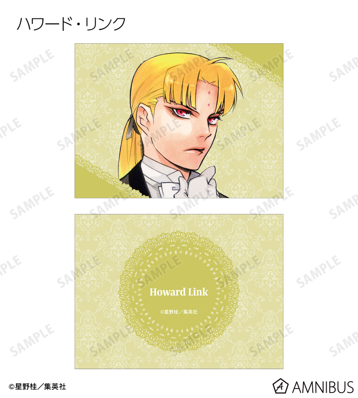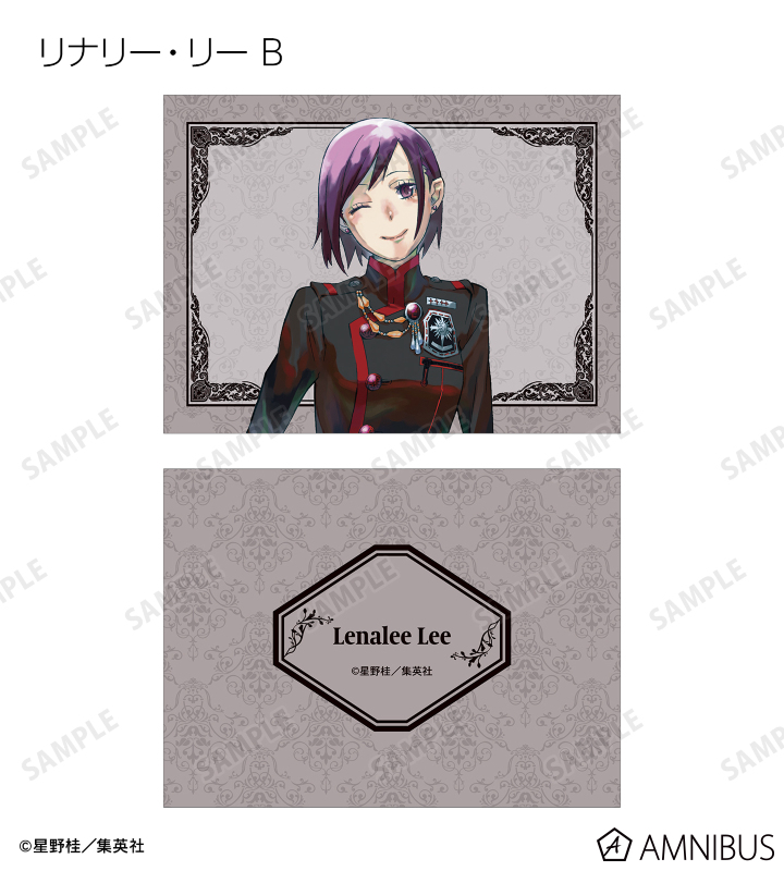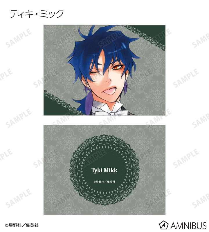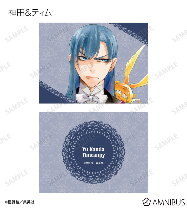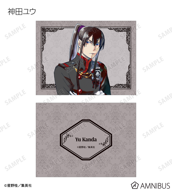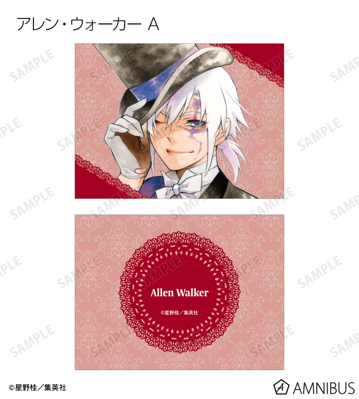 アレン・ウォーカー、神田ユウ、ティムキャンピー、ラビ、リナリー・リー、アレイスター・クロウリー三世、ミランダ・ロットー、ハワード・リンク、クロス・マリアン、ロード・キャメロット、ティキ・ミックのイラストを2つ折りのイラストカードに仕上げました。