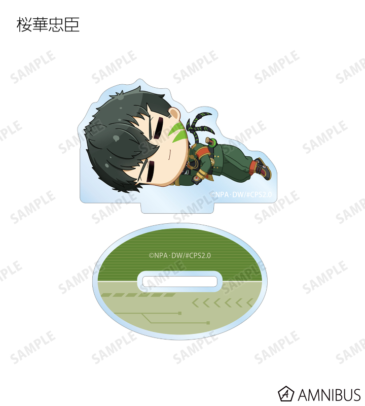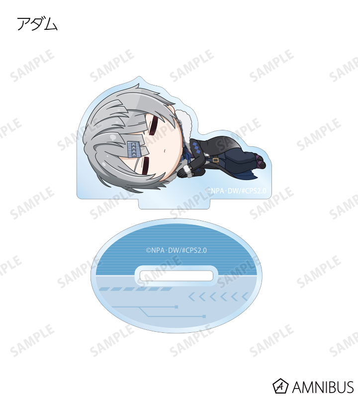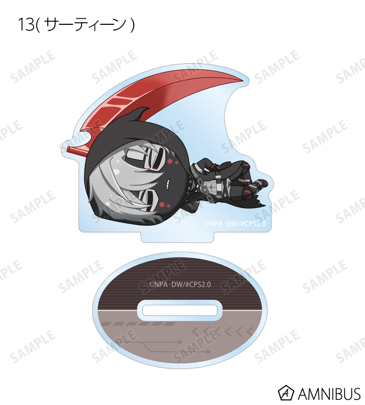 13(サーティーン)、零夜、ジャンヌ、Voidoll、十文字アタリ、桜華忠臣、ルチアーノ、深川まとい、マリア、アダム、狐ヶ咲甘色がころんと寝ているちびキャラを新たに描き起こし、アクリルスタンドに仕上げました。
