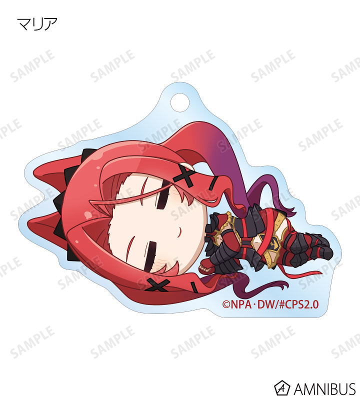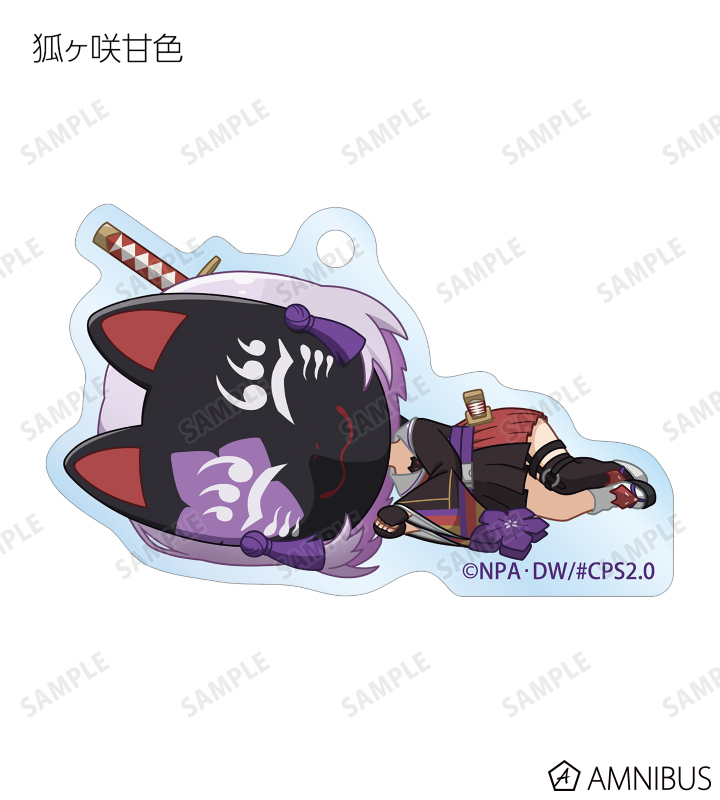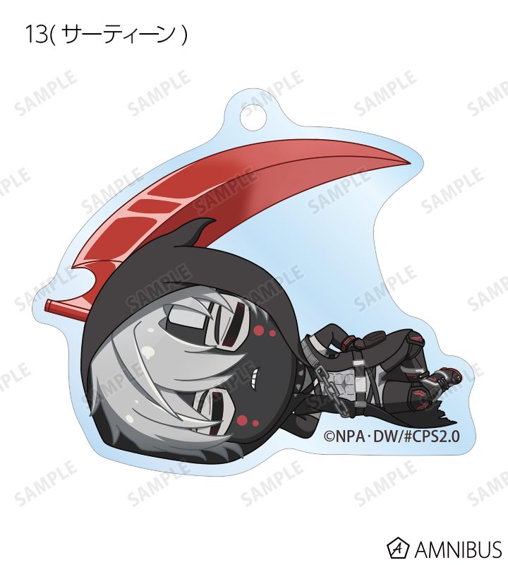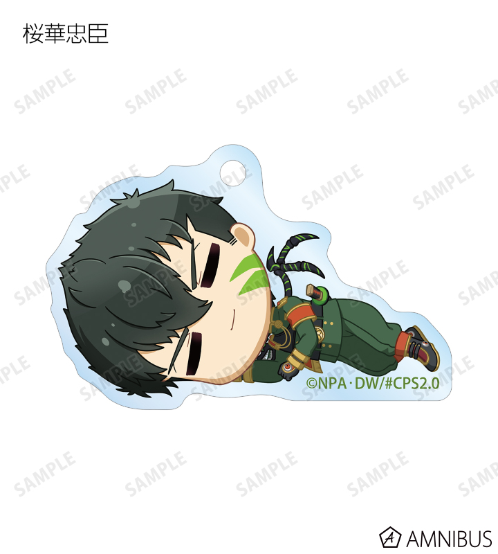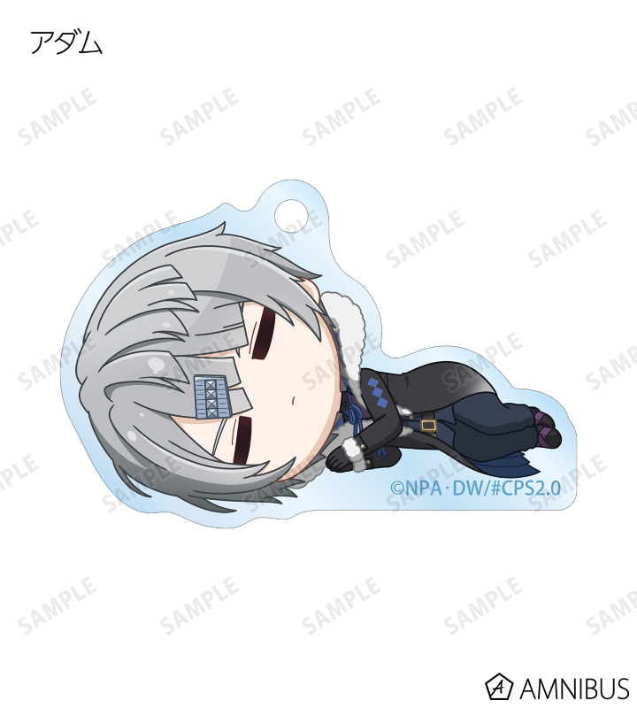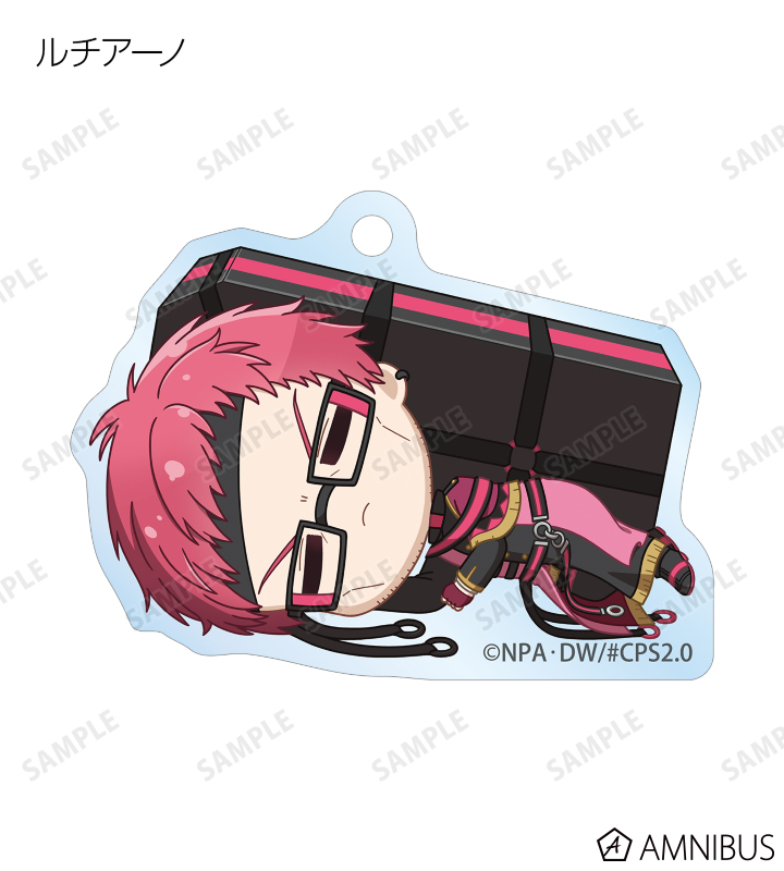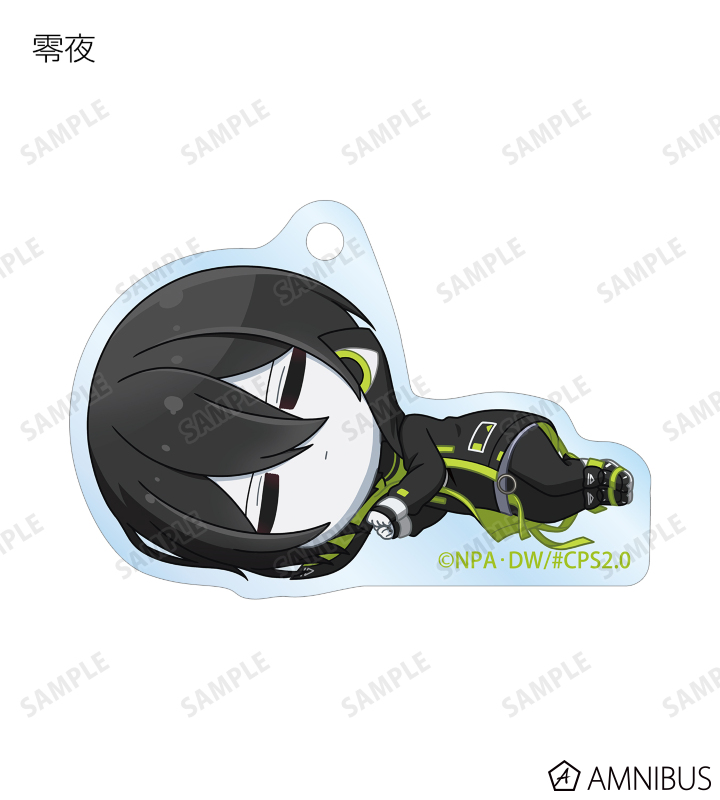 13(サーティーン)、零夜、ジャンヌ、Voidoll、十文字アタリ、桜華忠臣、ルチアーノ、深川まとい、マリア、アダム、狐ヶ咲甘色がころんと寝ているちびキャラを新たに描き起こし、アクリルキーホルダーに仕上げました。