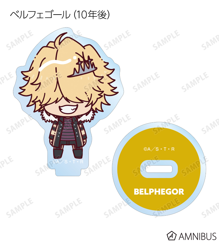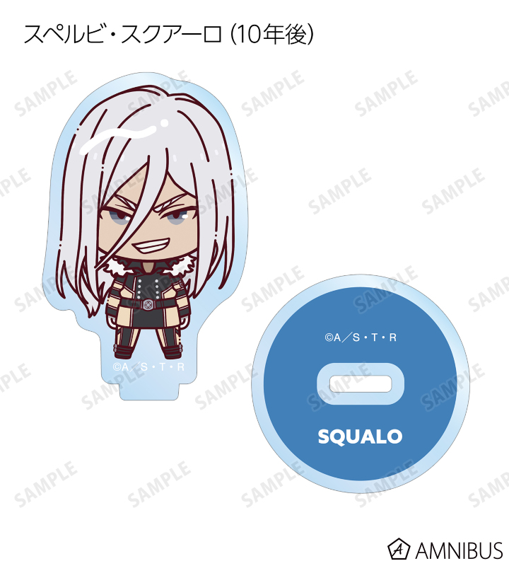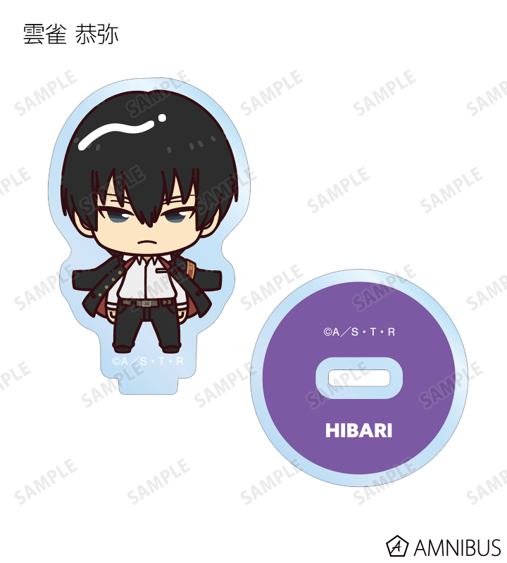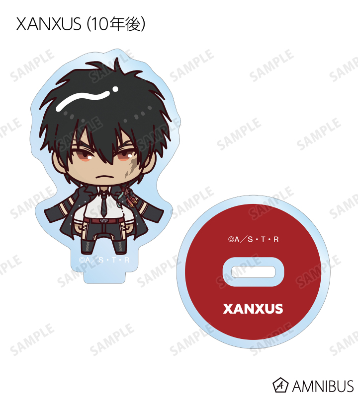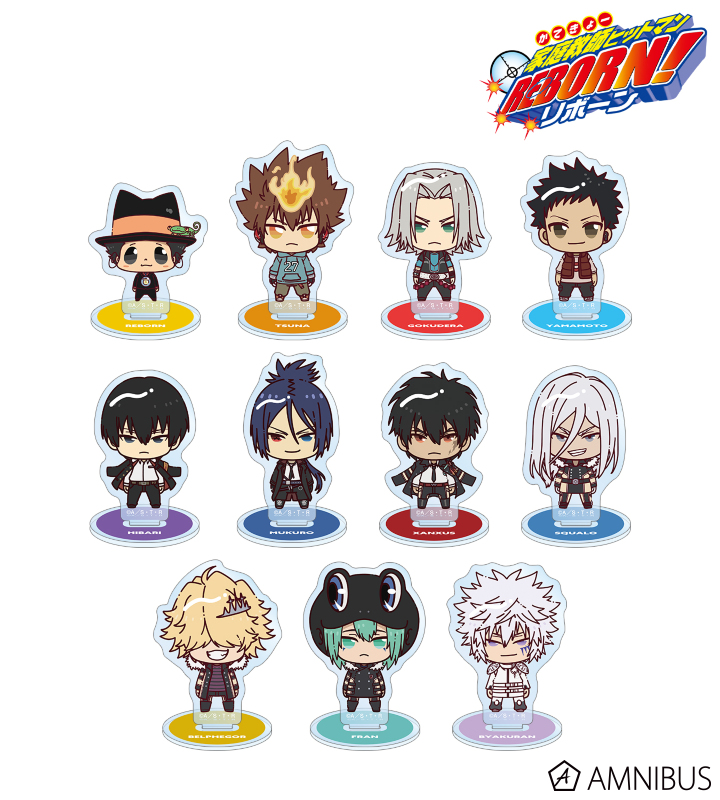 リボーン、沢田 綱吉、獄寺 隼人、山本 武、雲雀 恭弥、六道 骸(10年後)、XANXUS(10年後)、スペルビ・スクアーロ(10年後)、ベルフェゴール(10年後)、フラン、白蘭がちょこんと立っているちびキャラを新たに描き起こし、アクリルスタンドに仕上げました。