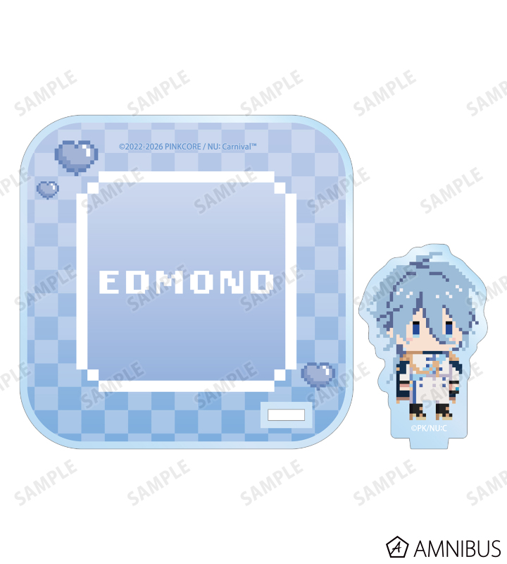エドモンドの描き起こしドット風ちびキャライラストをメインにデザインし、アクリルスタンド付きコースターに仕上げました。