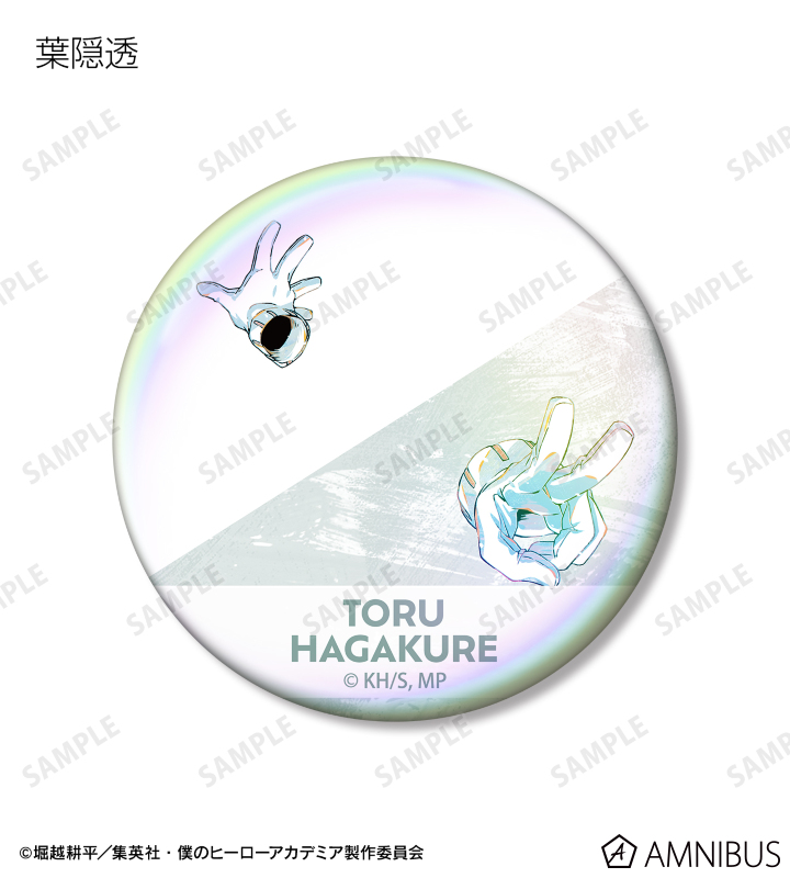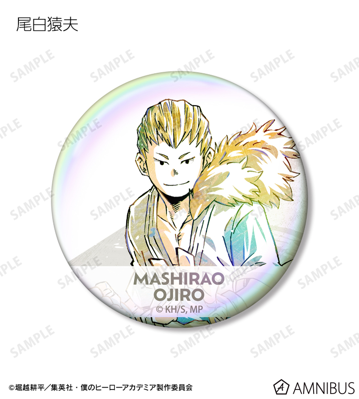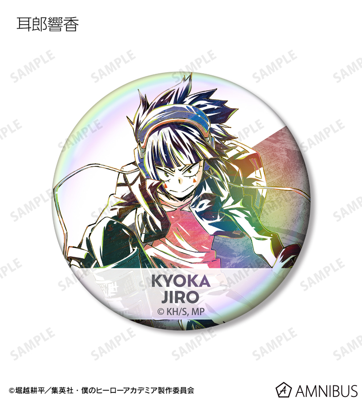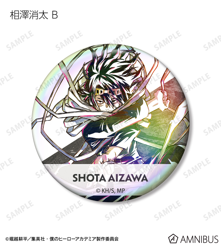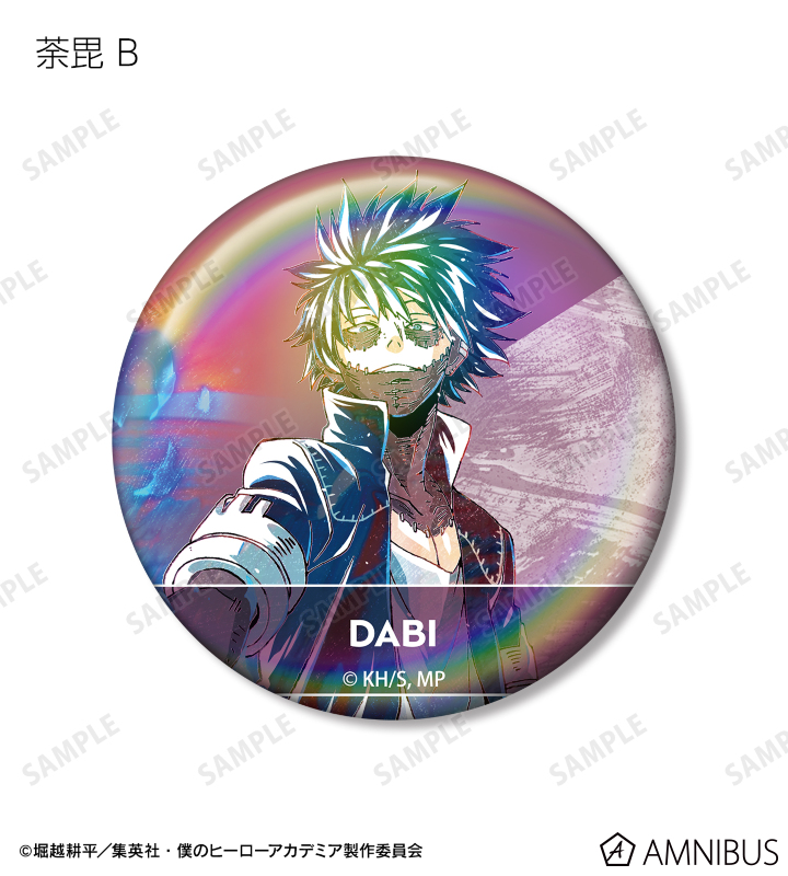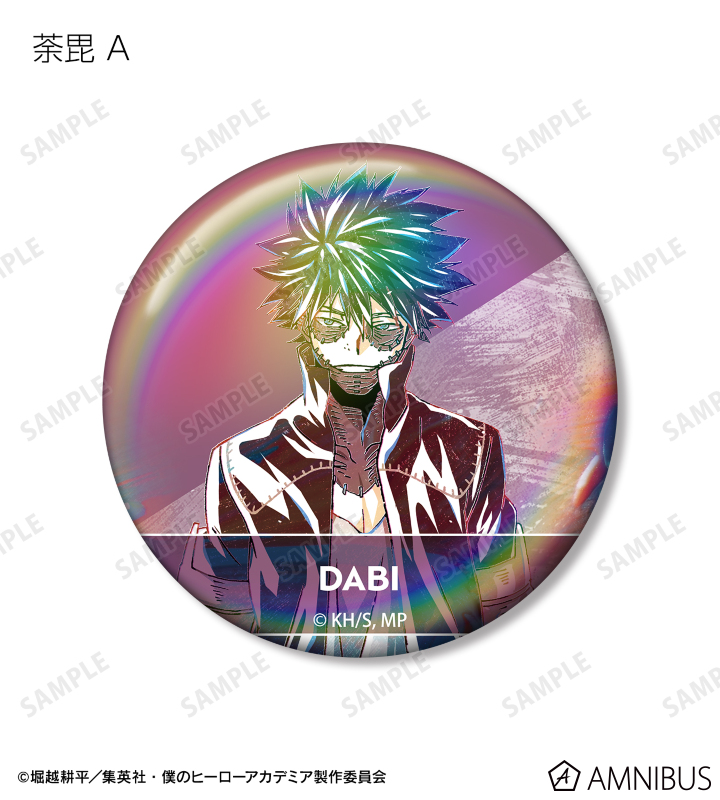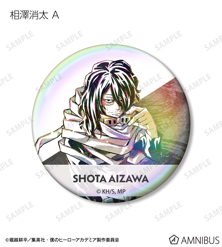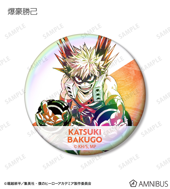 爆豪勝己、飯田天哉、上鳴電気、耳郎響香、尾白猿夫、葉隠透、角取ポニー、相澤消太、プレゼント・マイク、荼毘のビジュアルを新たなタッチで魅力的に表現し、オーロラ加工を施した缶バッジに仕上げました。