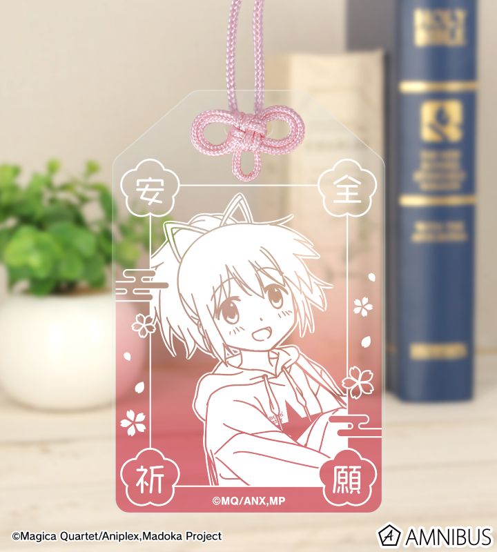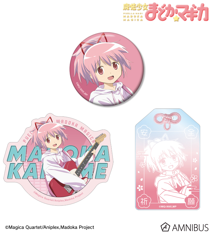 鹿目まどかの描き下ろしイラストを、アクリルお守り、缶バッジ、ステッカーの3点セットにまとめ、キャラクターの魅力あふれる、ジッパー付きの袋に入った、プレゼントやお土産にも使えるセットに仕上げました。