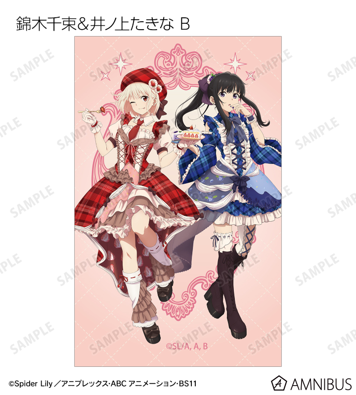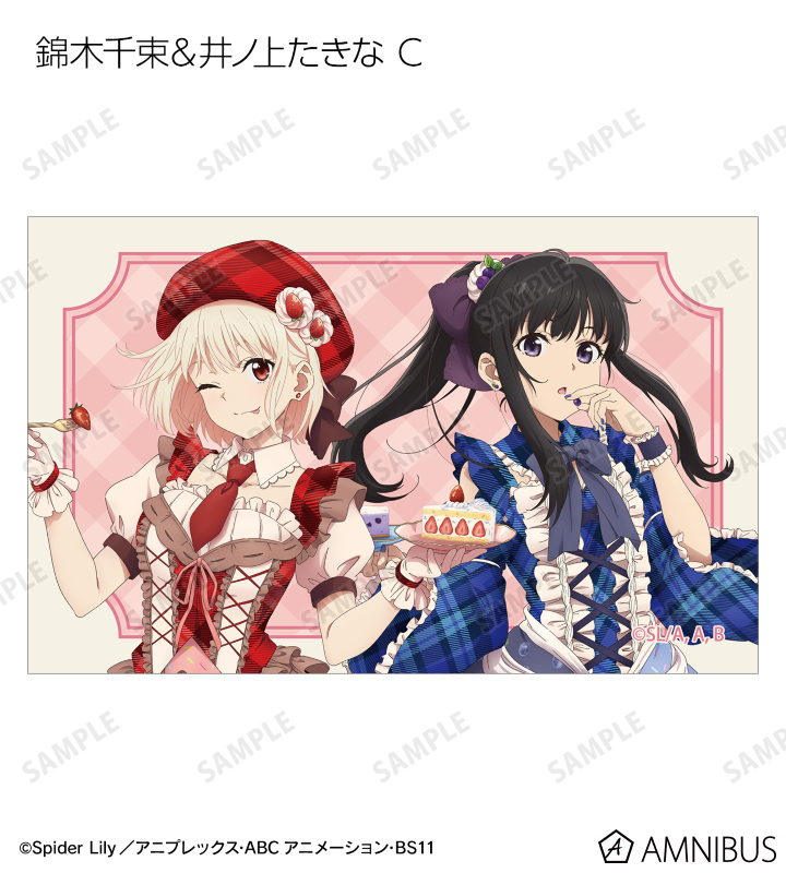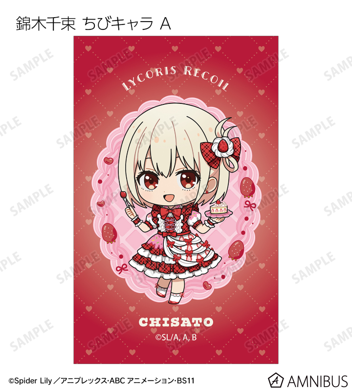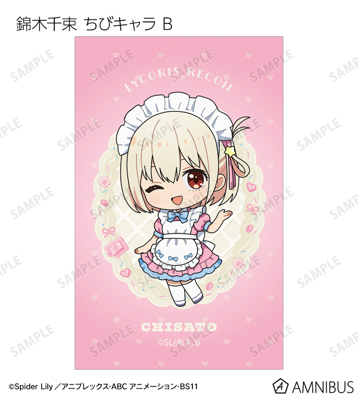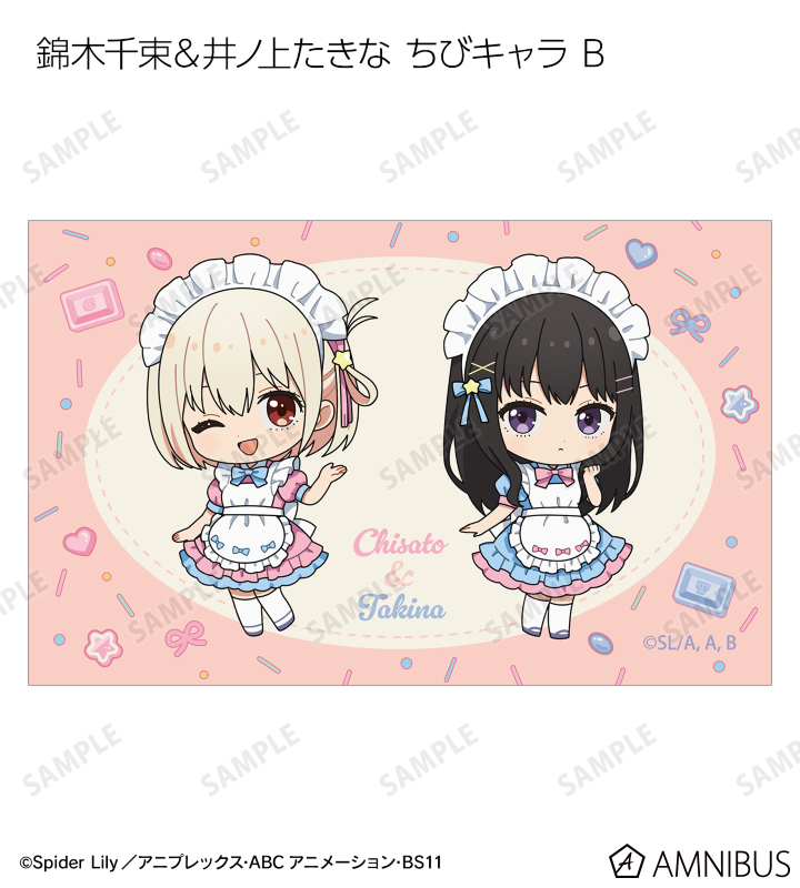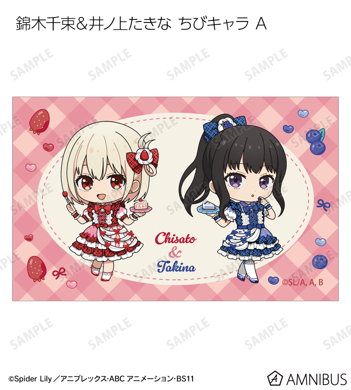 錦木千束、井ノ上たきなの描き下ろしイラスト、描き起こしちびキャライラストをイラストカードに仕上げました。