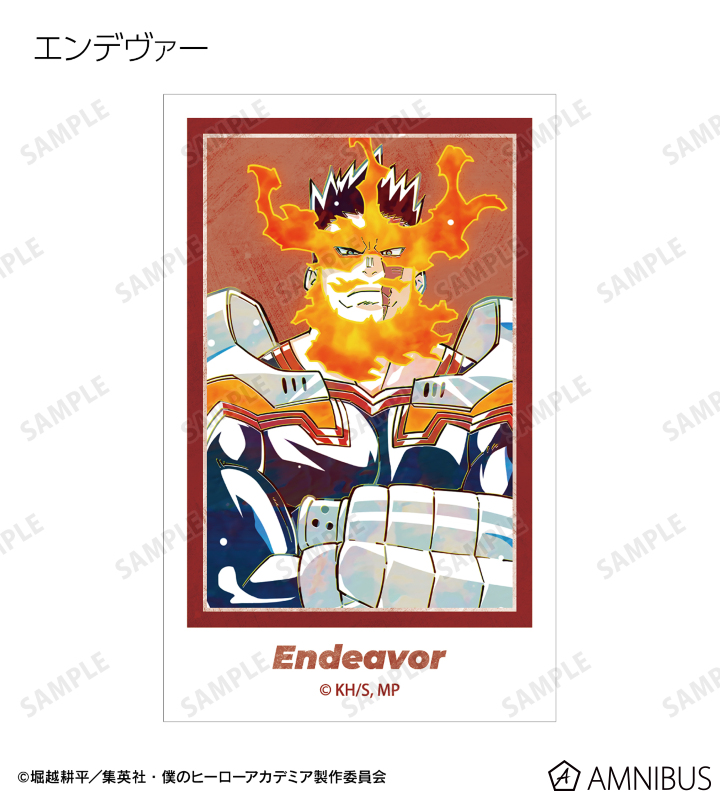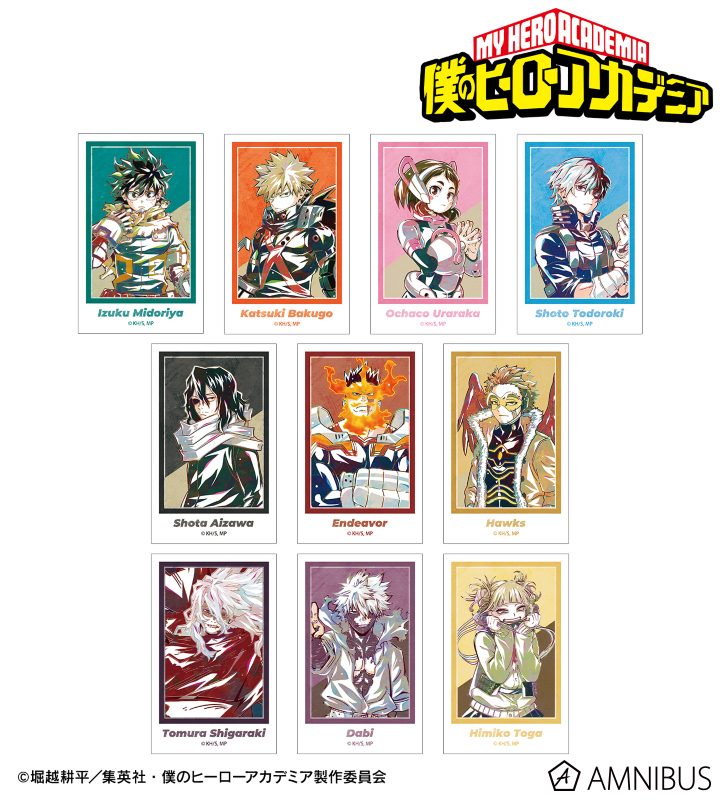 緑谷出久、爆豪勝己、麗日お茶子、轟焦凍、相澤消太、エンデヴァー、ホークス、死柄木弔、荼毘、トガヒミコのビジュアルを新たなタッチで魅力的に表現し、ビジュアルカードに仕上げました。