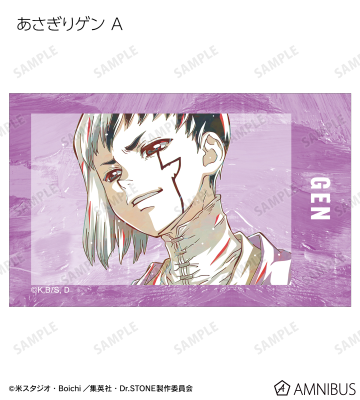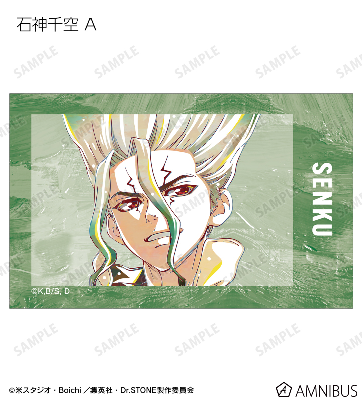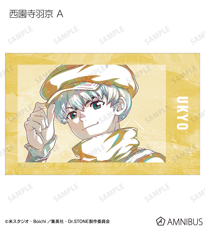 石神千空、あさぎりゲン、七海龍水、西園寺羽京、獅子王司、Dr.ゼノ、スタンリー・スナイダーのイラストを新たなタッチで魅力的に表現し、イラストカードに仕上げました。