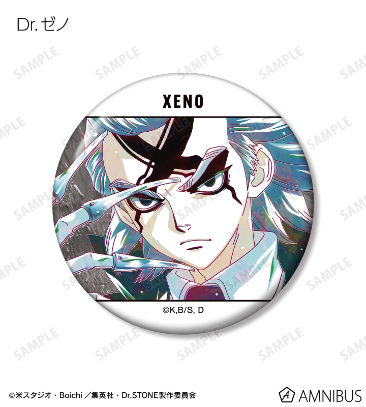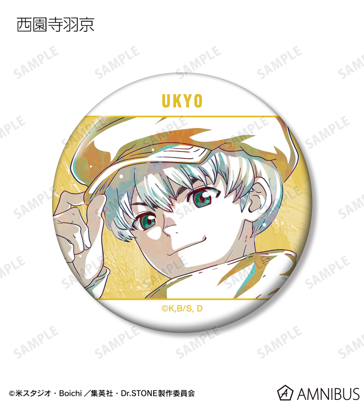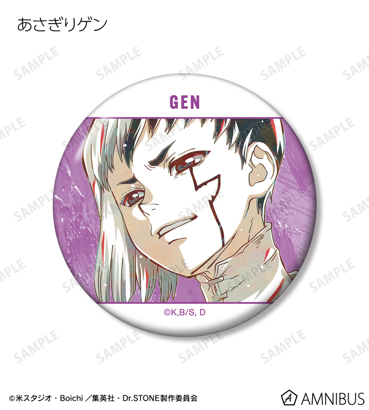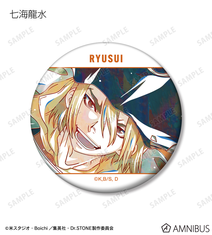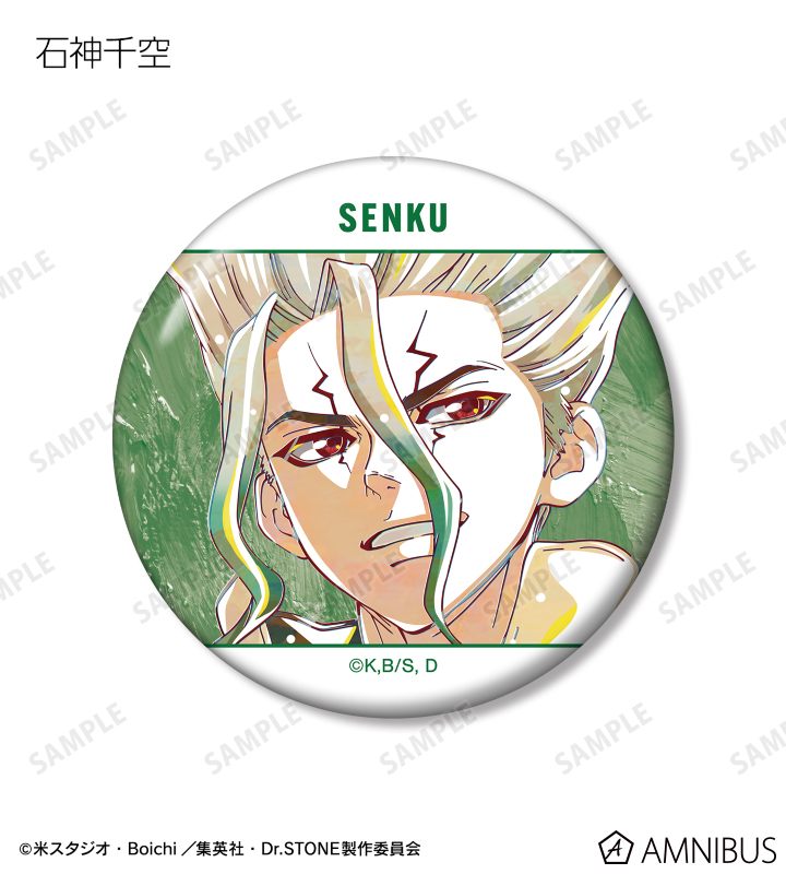 石神千空、あさぎりゲン、七海龍水、西園寺羽京、獅子王司、Dr.ゼノ、スタンリー・スナイダーのイラストを新たなタッチで魅力的に表現し、缶バッジに仕上げました。