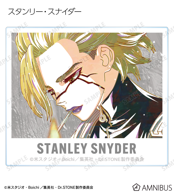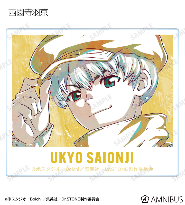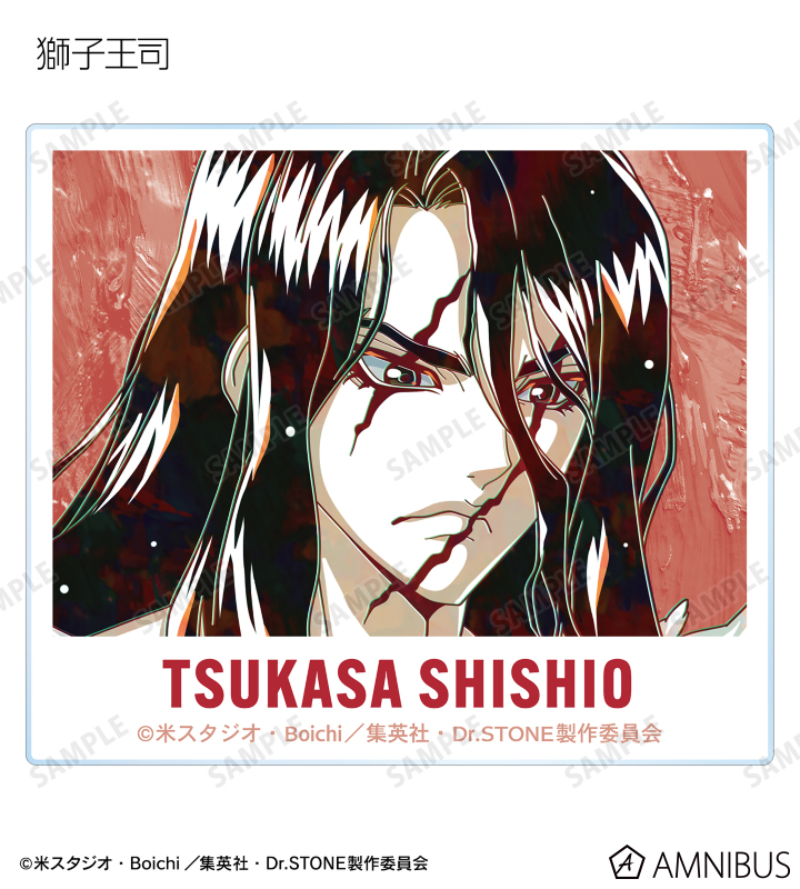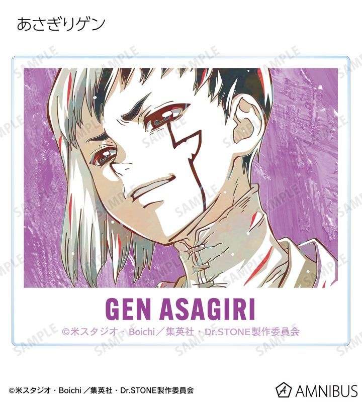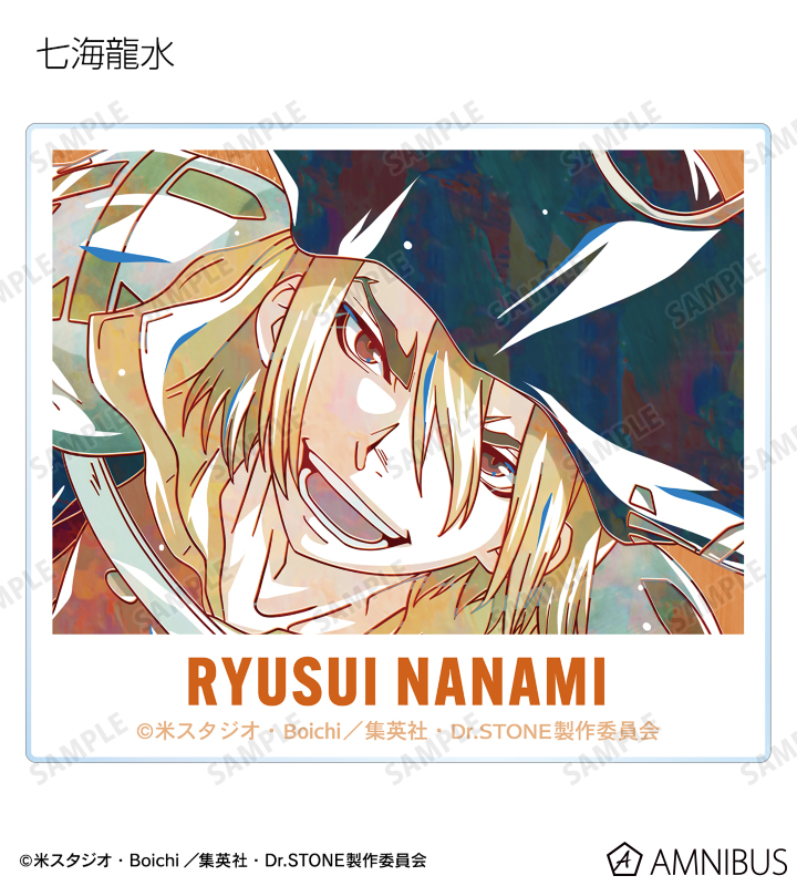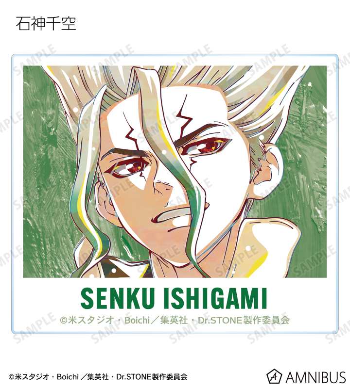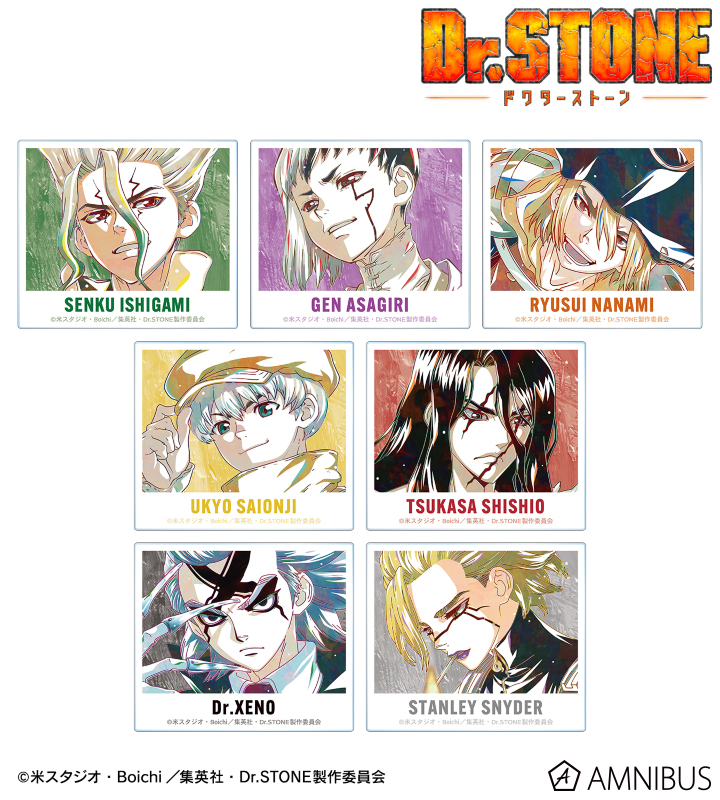 石神千空、あさぎりゲン、七海龍水、西園寺羽京、獅子王司、Dr.ゼノ、スタンリー・スナイダーのイラストを新たなタッチで魅力的に表現し、アクリルカードに仕上げました。