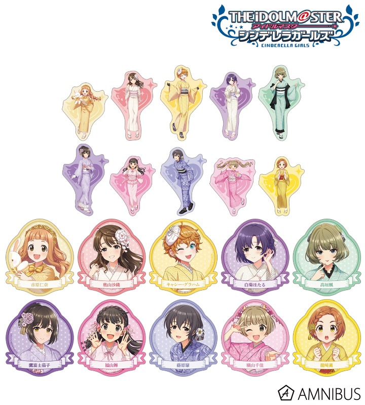 市原仁奈、奥山沙織、キャシー・グラハム、白菊ほたる、高垣楓、鷹富士茄子、福山舞、藤原肇、横山千佳、龍崎薫の描き下ろしイラストをダイカットのステッカーに仕上げました。