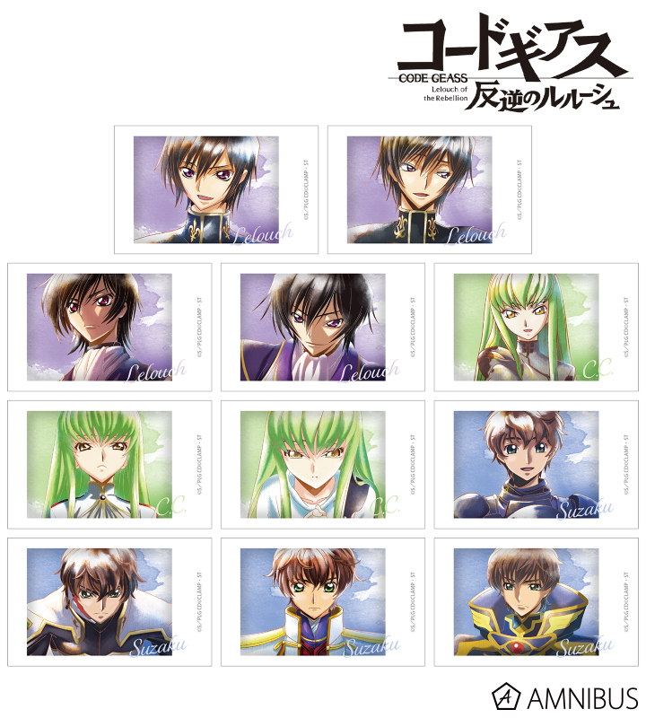 ルルーシュ、C.C.、スザクのイラストを新たなタッチで魅力的に表現し、イラストカードに仕上げました。