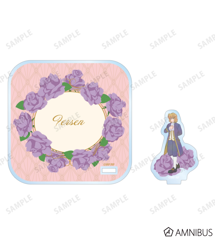 フェルゼンのイラストをボタニカルデザインに落とし込んで繊細なタッチで新たに描き起こし、アクリルスタンド付きコースターに仕上げました。