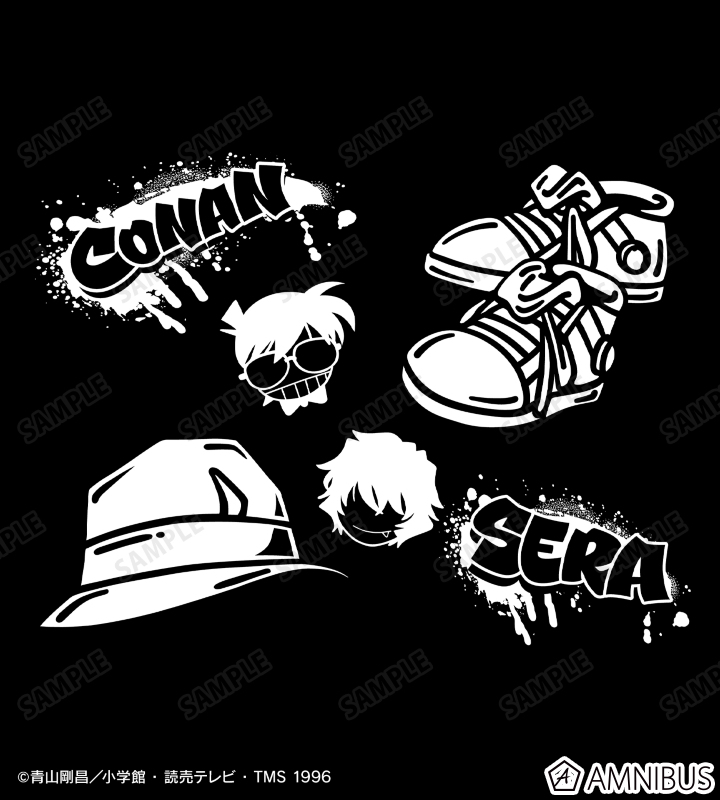 江戸川コナン、世良真純の名前とキック力増強シューズ、バケットハットの3点をグラフィティモチーフとして描き起こし、キャラクターアイコンと組み合わせてBIGなジップトートバッグに仕上げました。