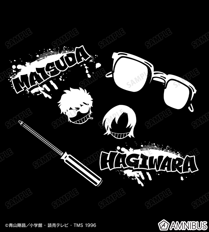 松田陣平、萩原研二の名前とサングラス、ドライバーの3点をグラフィティモチーフとして描き起こし、キャラクターアイコンと組み合わせてBIGなジップトートバッグに仕上げました。
